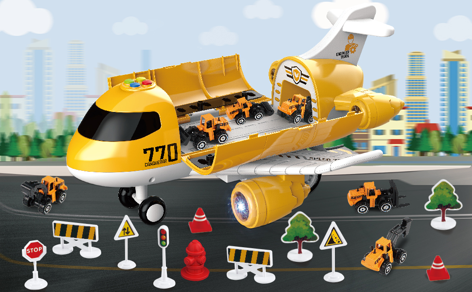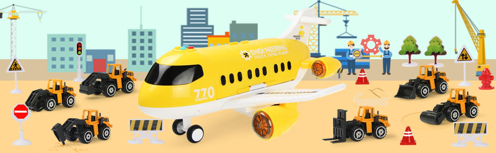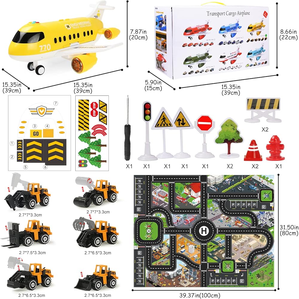 Hapavis Airplane Toys with Construction Truck Engineering Vehicle Play Mat Road Sign Transport Cargo Airplane Car Toy Play Set with Vehicle Car Toy for Boys Kids
