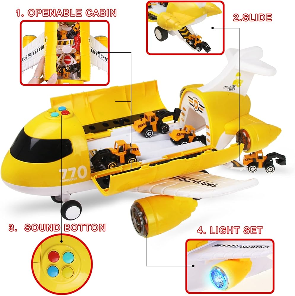 Interesting inertial airplane: The doors of the airplane can be opened and accommodate multiple cars. There is a chute between the cabin and the tail, and the toy car slides out when the "Go" button is pressed. There are four buttons on the top of the cab, and when you press it, you can see bright flashing lights and hear four different sounds such as the plane taking off. Requires 3 AA batteries (not included).