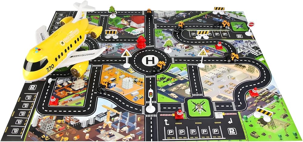 Comfortable and unique activity play mat: The play mat is made of soft non-woven fabric and shows us scenes with different themes, including architecture, fire, military, police. It's big enough for 2 to 4 players to have a good time together. Carpet size :31.5 inches x 39.4 inches.