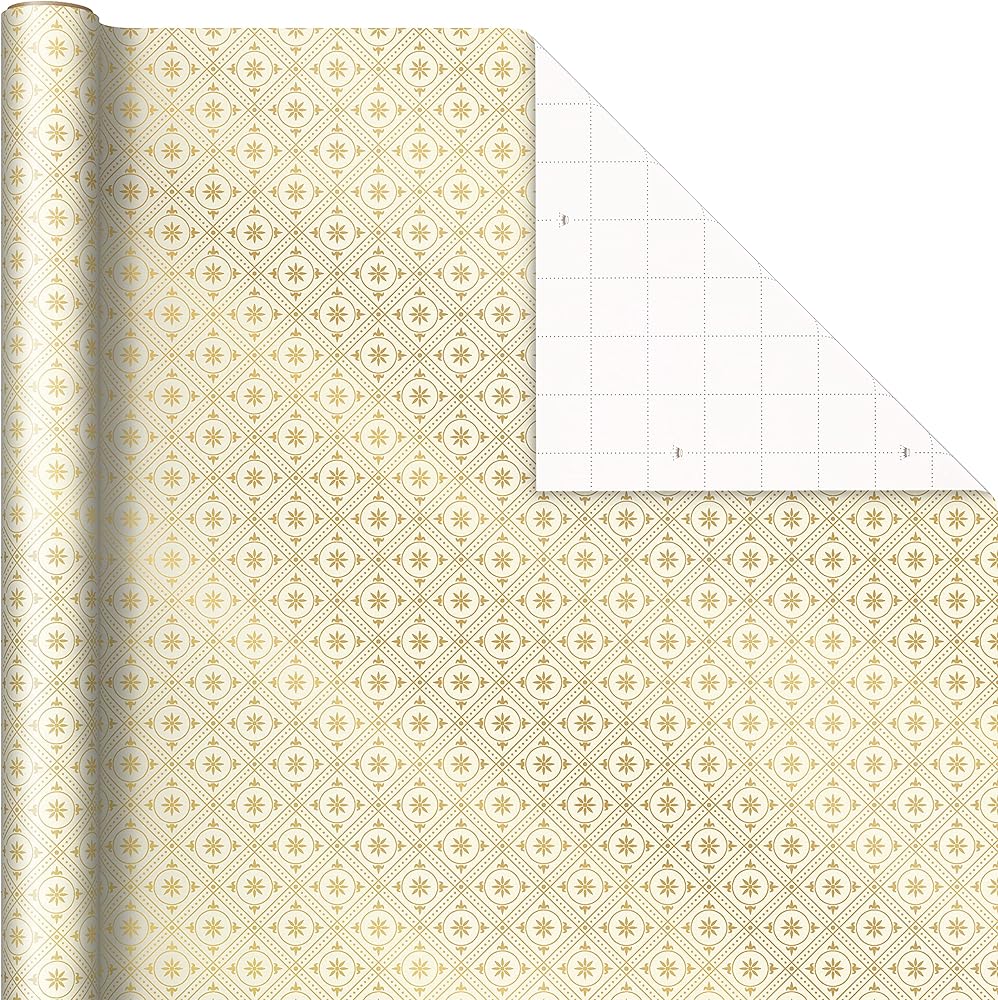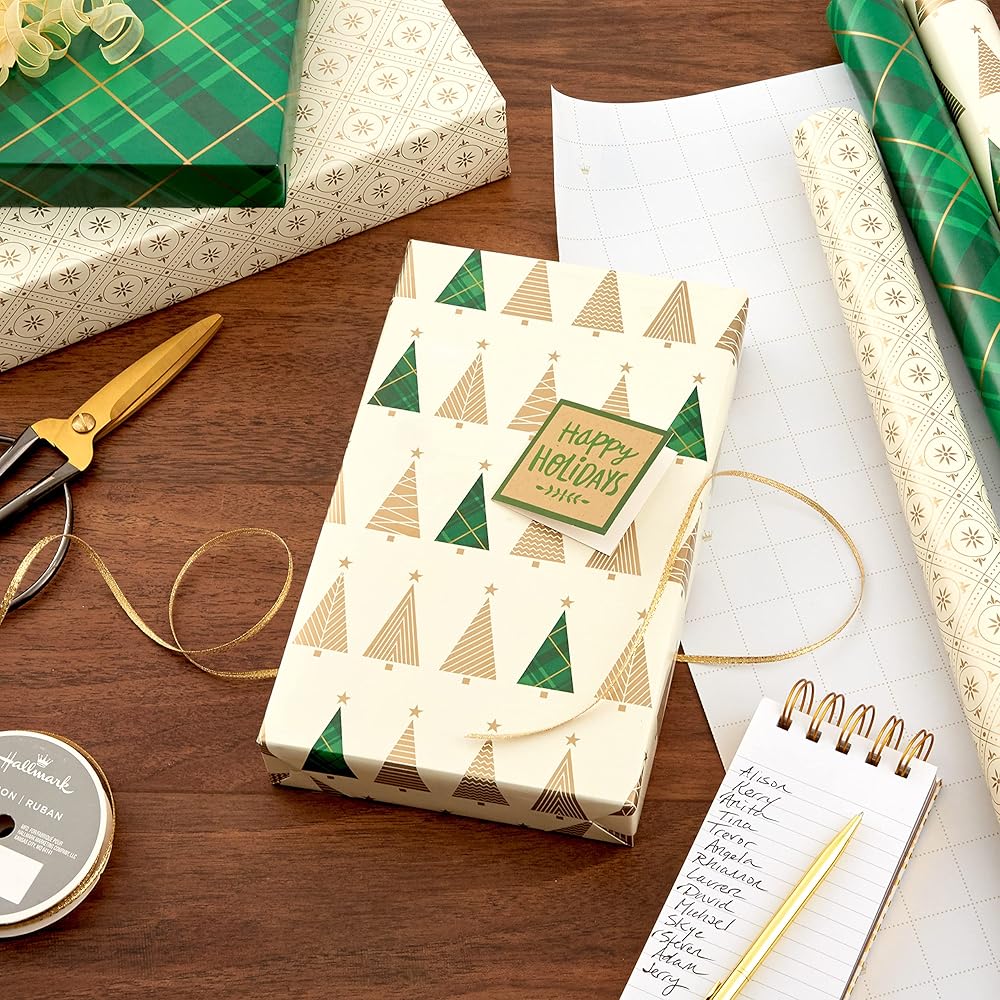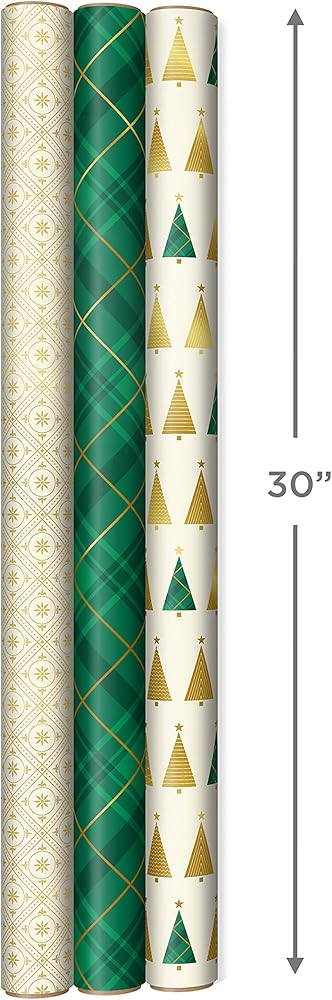 Celebrate the holiday season with minimalistic Christmas wrapping paper in simple red and gold prints. Bundle of holiday wrapping paper features 3 beautiful designs, including Christmas trees in white and gold on red, white with mini gold dots, red with thin gold stripes. Plenty of footage to wrap gifts for kids, grandchildren, neighbors, coworkers, family and friends. Each roll of gift wrap features grid lines on the reverse side for straight cutting and perfectly wrapped presents. The Hallmark brand is widely recognized as the very best for greeting cards, gift wrap, and more. For more than 100 years, Hallmark has been helping its customers make everyday moments more beautiful and celebrations more joyful.