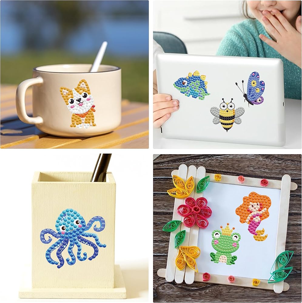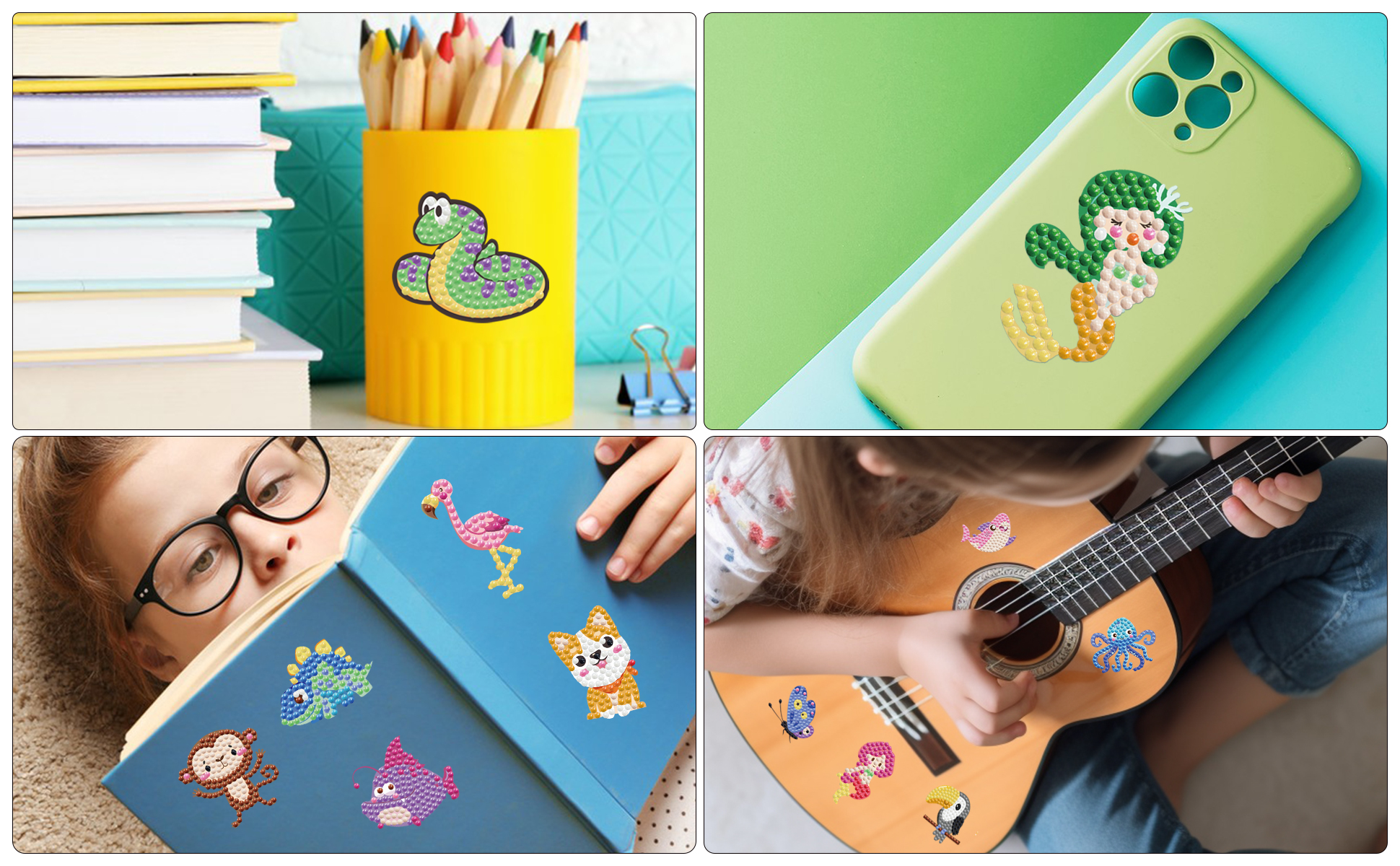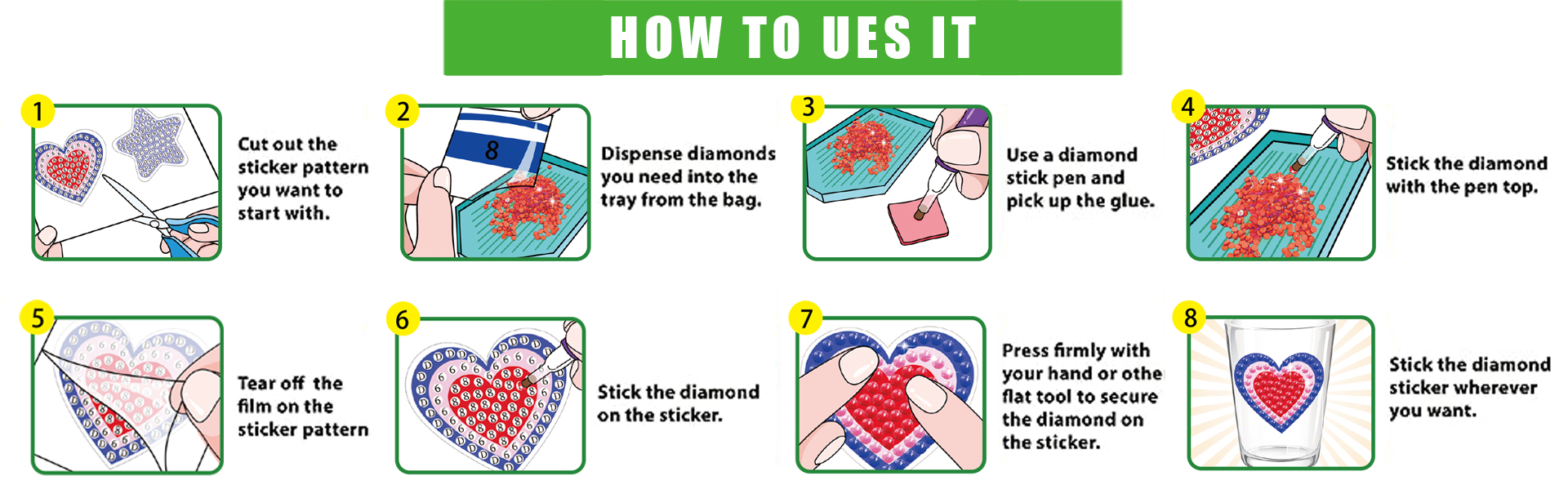 【Simple to apply or stick wherever you want】 steps to DIY diamond painting kits : 1. cut out the sticker you want to DIY. 2. Dispense diamond you need into the tray 3. Use the diamond sticky pen and put it to the clay for a moment 4. Stick the diamond with the pen top 5. Tear off the film on the sticker patter. 6. start to DIY your diamond craft . 7. Press firmly with your hand or other flat tool to secure the diamond on the sticker