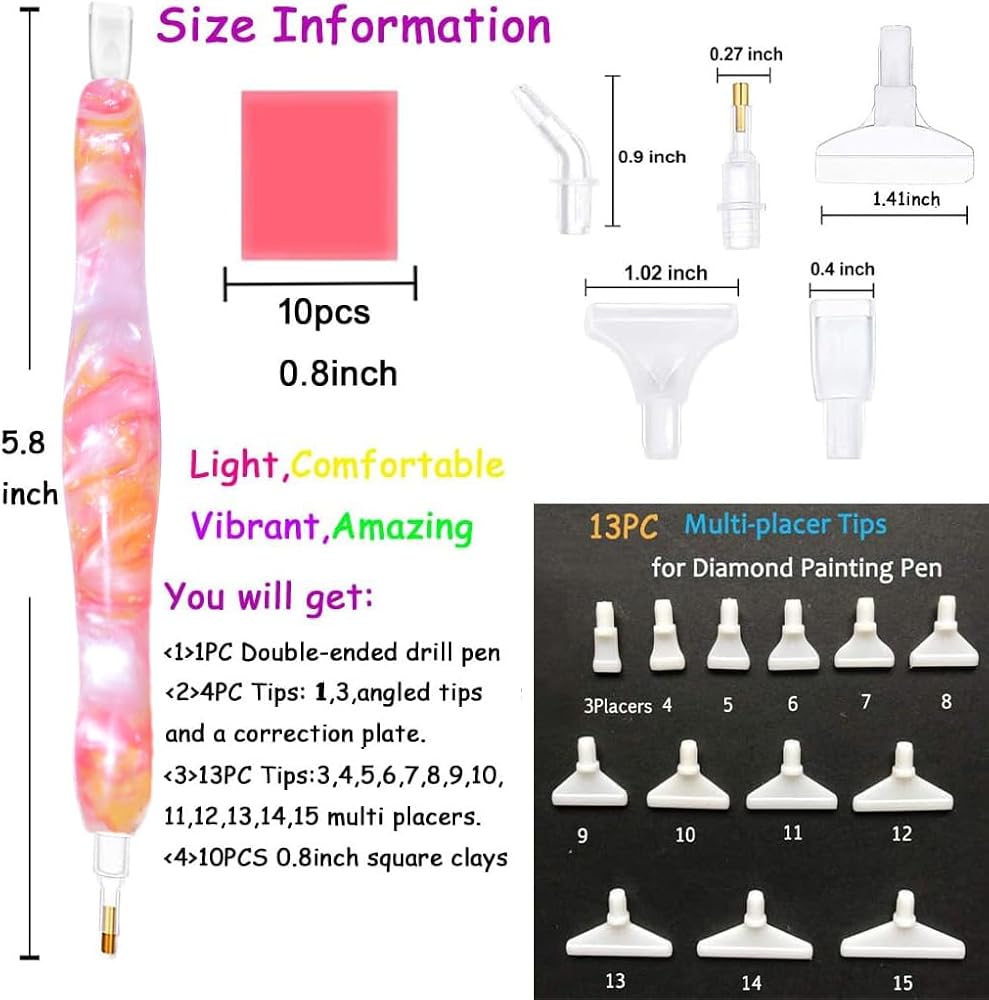 ?Super Comfortable Handmade Resin?The diamond painting pen is made of 100 Percent handmade resin and the acrylic curves. Light weight and Super Comfortable to hold.The design makes it easy to grip!Fits hand perfectly,great to work on diamond painting with.Its just the right length and its durable!You can diamond paint for hours with no hand cramping at all. Drilling speed up to 2 times faster than regular stylus pen. It can help you complete the 5D diamond painting kit much more easily and faster.