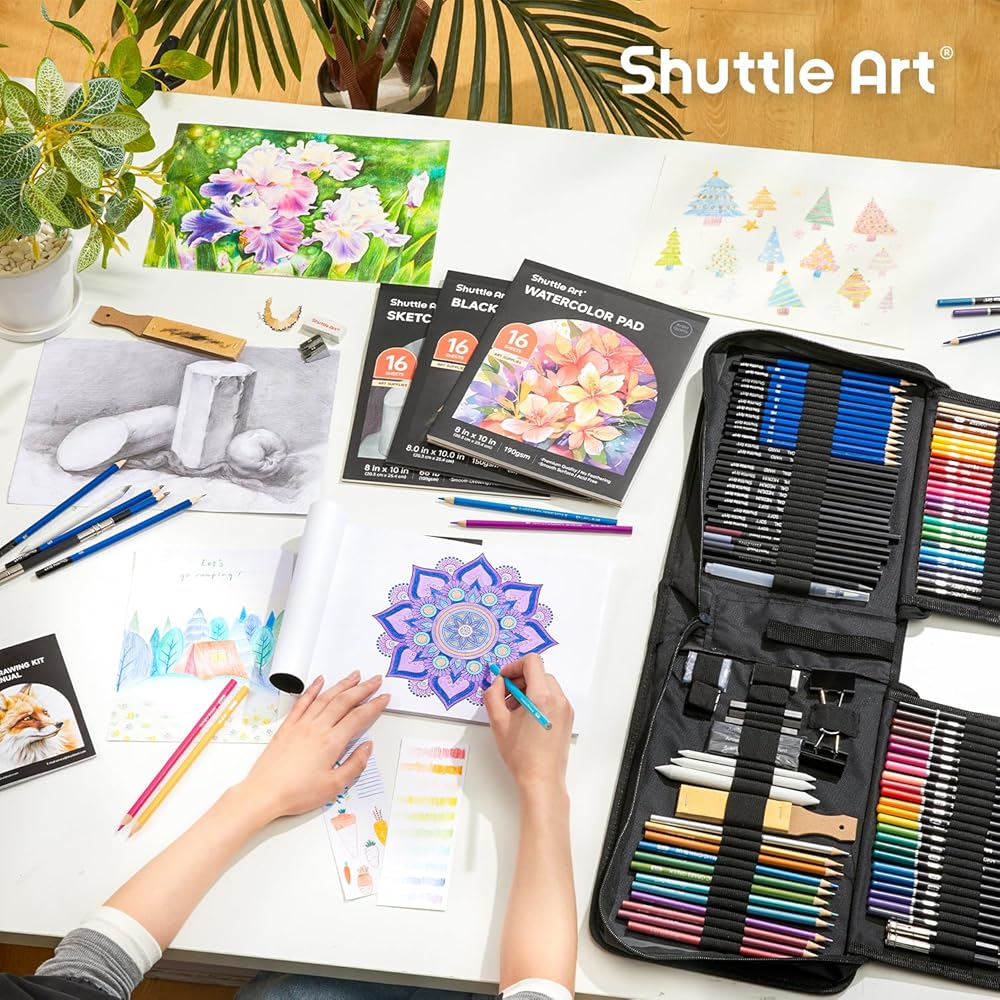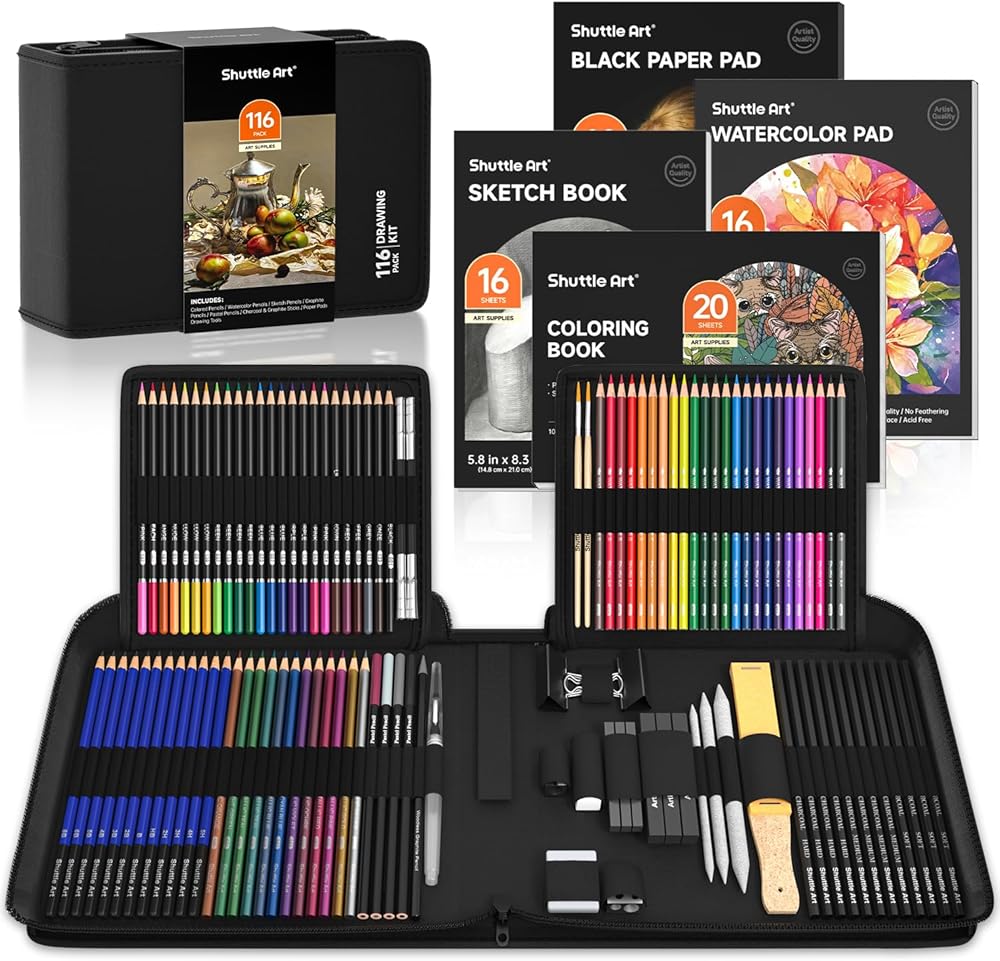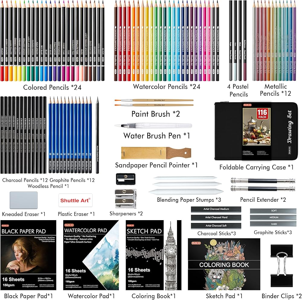 Shuttle Art 116 PCS Drawing Kit, Professional Drawing Supplies with Sketch, Charcoal, Colored, Graphite, Pastel Pencils & Sticks, Complete Drawing Tools and Paper Pads in Zipper Case for Artists&Kids