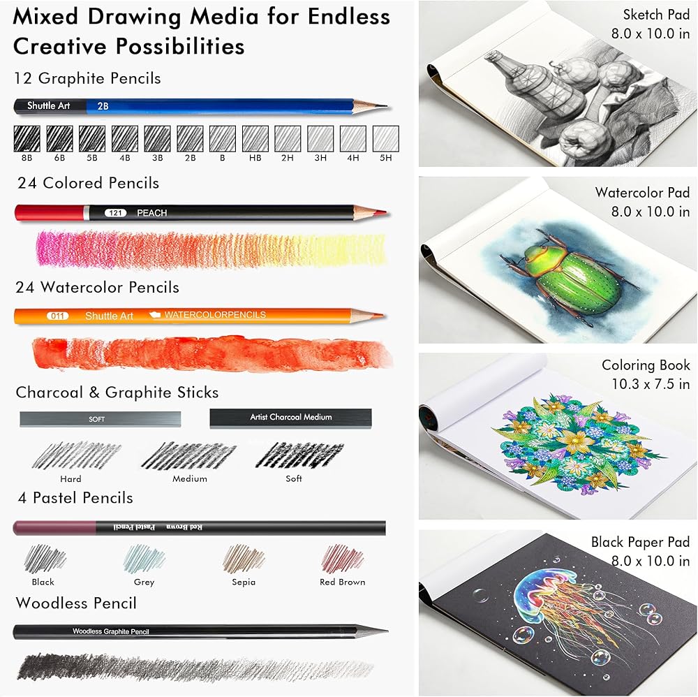 COMPLETE DRAWING KIT: Shuttle Art 116 pack drawing pencils set includes 24 colored pencils, 24 watercolor pencils, 12 metallic colored pencils, 12 graphite pencils, 12 charcoal pencils, 4 pastel pencils, 1 woodless graphite pencil, 3 charcoal sticks and 3 graphite sticks and versatile drawing tools and paper pads, perfect for creating art works with coloring, drawing, sketching and more.