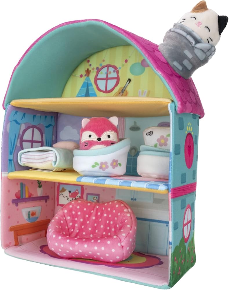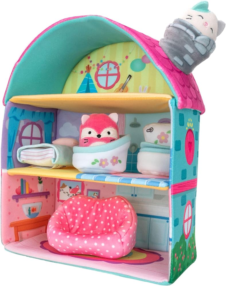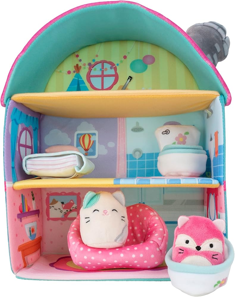 Cottage sweet cottage. Squish into one of the Squishville plush world's coziest abodes, Fifi's Cottage. This Amazon Exclusive item features 2 of your favorite Squishmallows plush, Blair the cat and Fifi the red fox, in a mini 2-inch size. This grand-sized three-story cottage is perfect for building out this exciting new world. The plush Squishville toy world is made with super-soft filling, making it the coziest place on earth. Squish and squeeze Blair and Fifi into the couch, toilet, the chimney, and more. There are 5 fun rooms to squeeze into and 4 squishy accessories to play with. With vehicles, playsets, and your favorite Squishmallow plush characters, the Squishville plush toy world is bursting with squish-ibilities.
