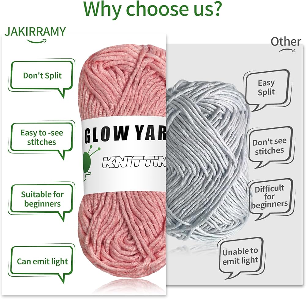 🧶Glow in the Dark: different colors of our glow in the dark yarns will emit different light, especially beautiful in the night, the glow effect depends on ultraviolet light; If you have a flashlight, you can charge our yarn, if not, you can put it in the sun; In the courier box for a long time, it needs to absorb enough light to play the luminous effect