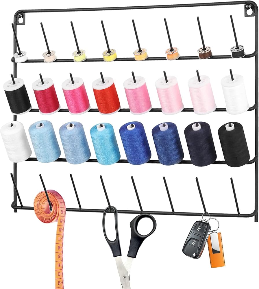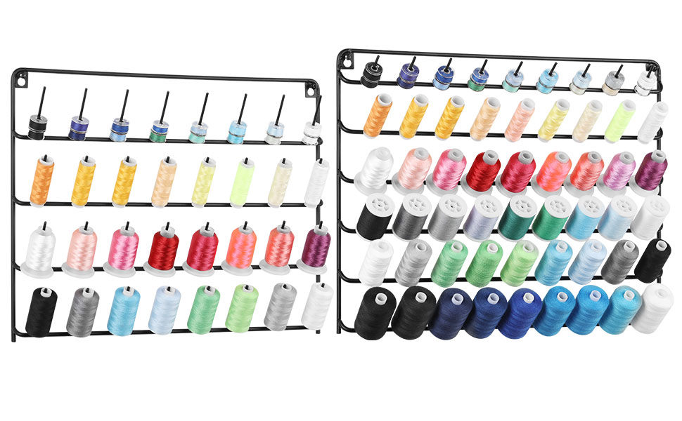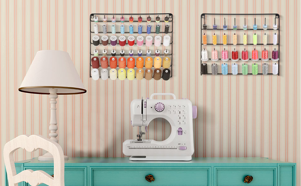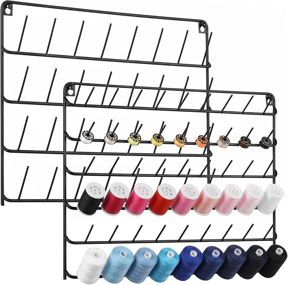 【QUICKLY FIND THE COLOR YOU WANT】 2 pack spools of thread holder organizer are wall-mounted design, and there are ten layers in total. Each layer of pins can be well organized with different colors and different types of thread spools. You can quickly find the color you want when you look up to get a more relaxed organization experience on the sewing day.