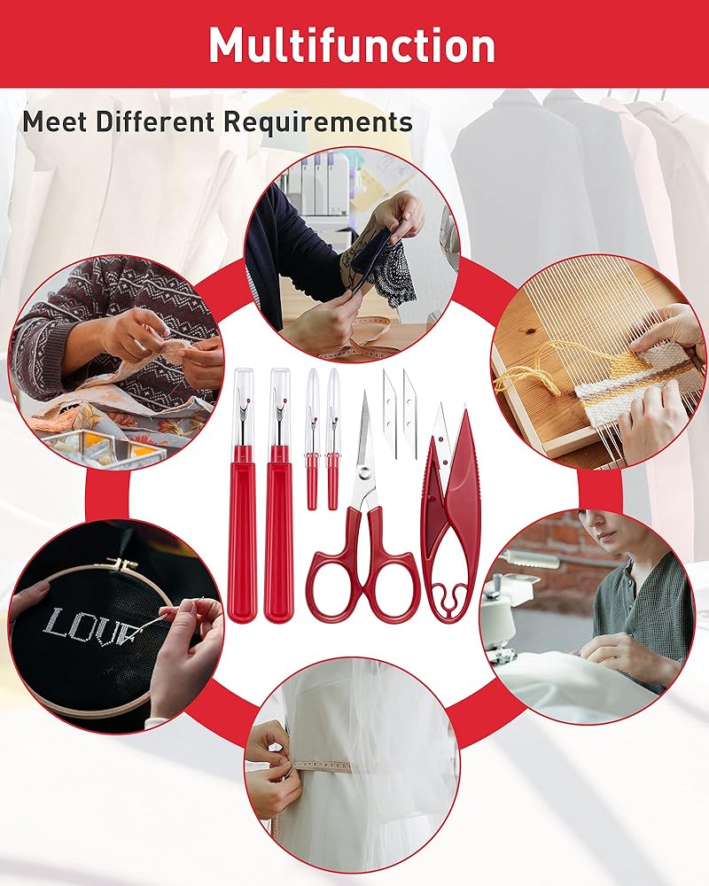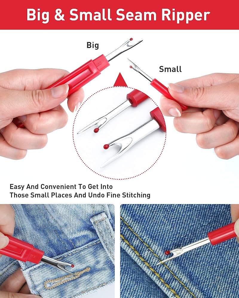 PERFECT APPLICABILITY - Making your life simpler and easier, the longer fork of seam ripper helps you pick out sewn threads, the small sewing ripper allows easy and convenient access to those small places to unravel fine seams, the large sewing ripper is sharp and can cut through multiple layers of fabric quickly and easily, and the clear plastic cap extends the handle of the small sewing ripper to save your effort.