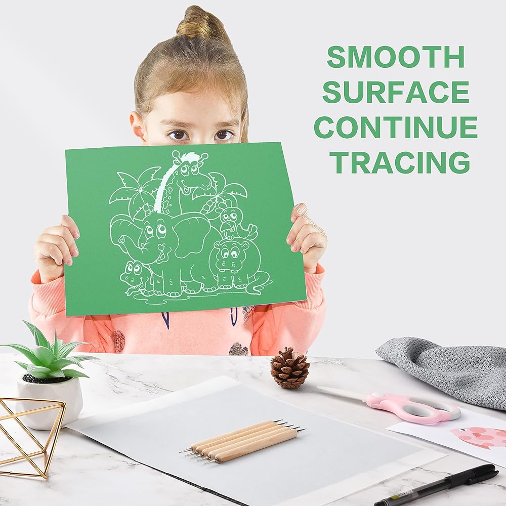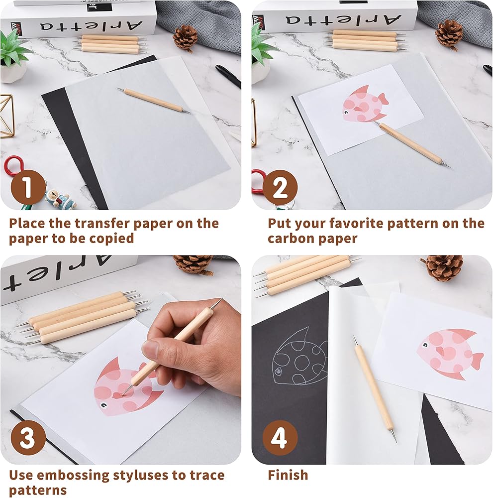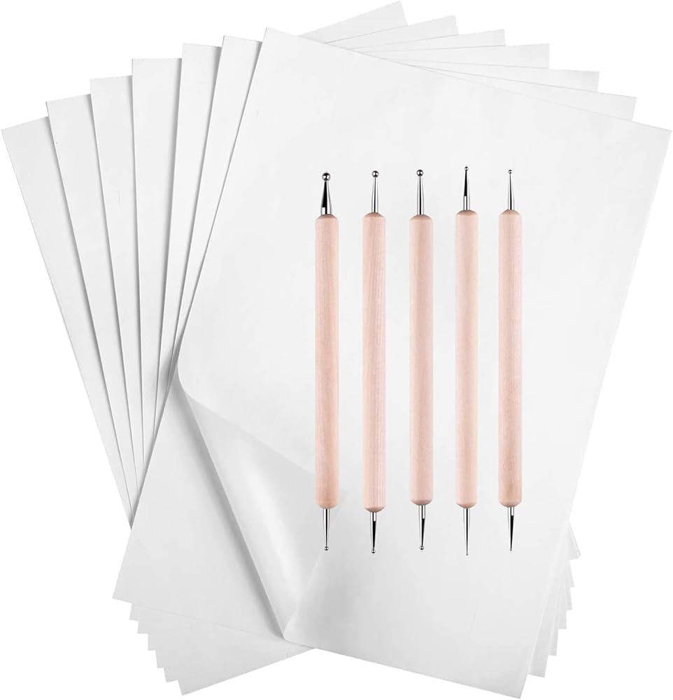 Packing Include: 50 sheets carbon papers and 5 Pcs Embossing Stylus Dotting Tools. A4 Size 50 sheets white carbon copy paper that are great for tracing pictures or frames, makes creating designs so much easier