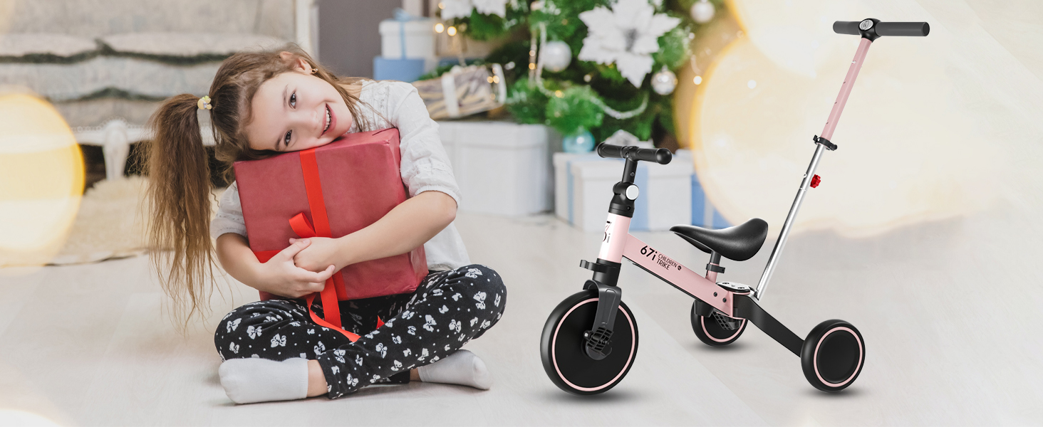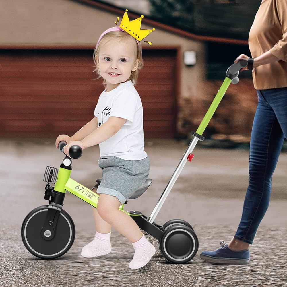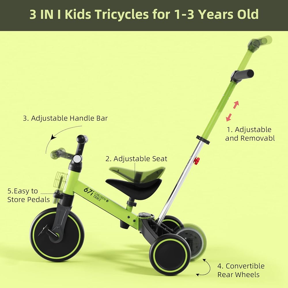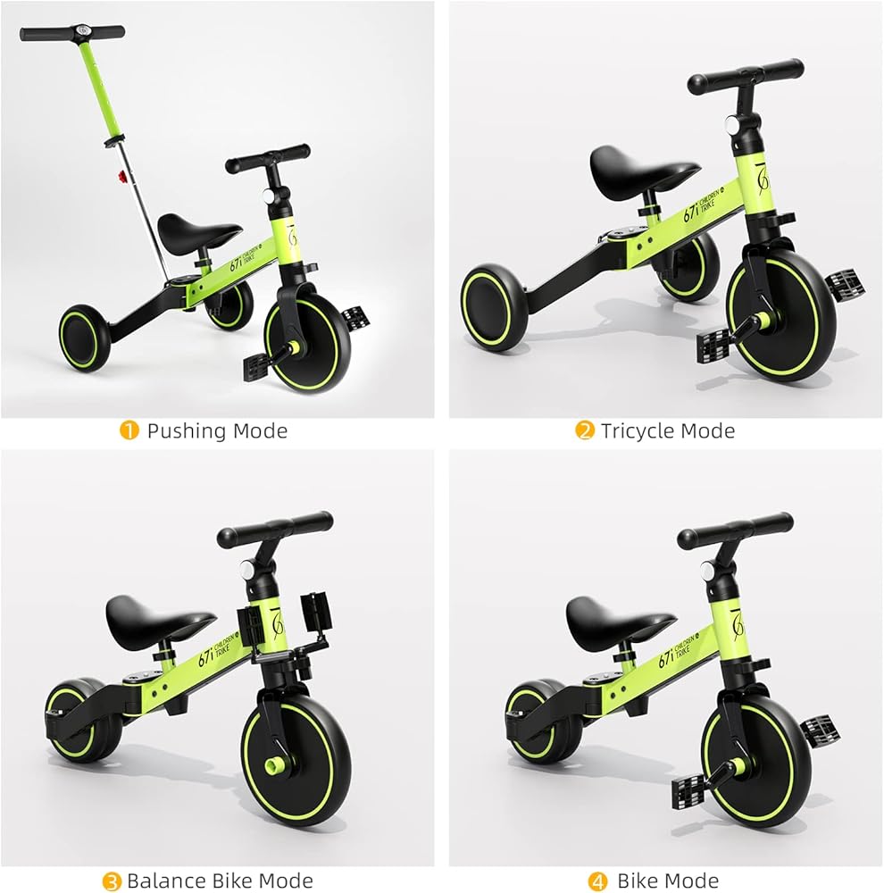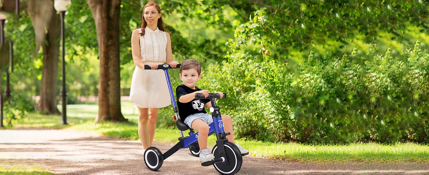 FOUR WAYS TO RIDE: This kids tricycles with Parent push mode, Tricycle mode, Balance bike mode and Bike mode. Multifunctional tricycle is suitable for 1-3 years old boys and girls