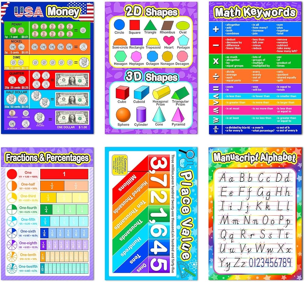 Multiplication chart, division chart, addition chart, subtraction chart, fractions and percentages, place value, USA currency and 3D shapes.