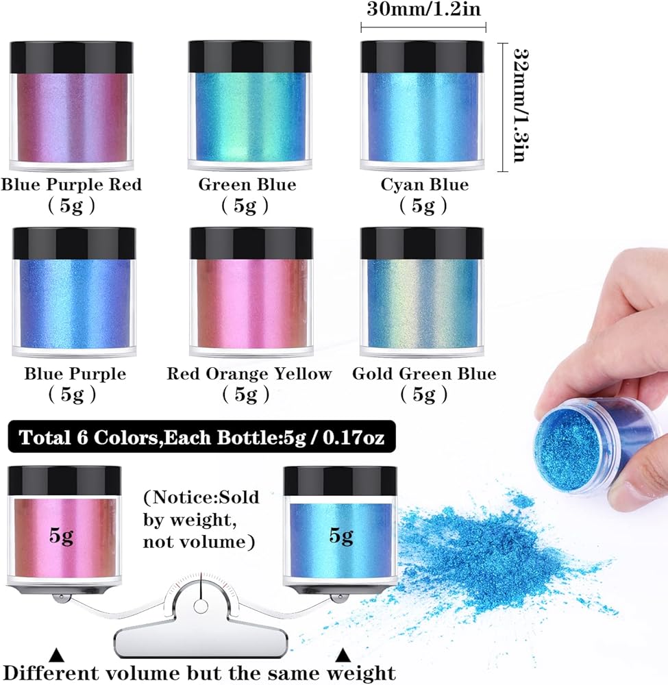 【6 Jars Chameleon Mica Powder】6 jar color shifting mica powder, each 5g/0.17oz, the whole weight is 30g/1.1oz. Comes in jars and not baggies which makes it easier to dip paint brush into. It doesn't take much to cover a piece so these color changing pigment will last you for a long time . Note: All the jars are filled by weight, not volume. And the jar probably isn't fully fulfilled due to the transportation turbulence, but each 5g/0.17oz.