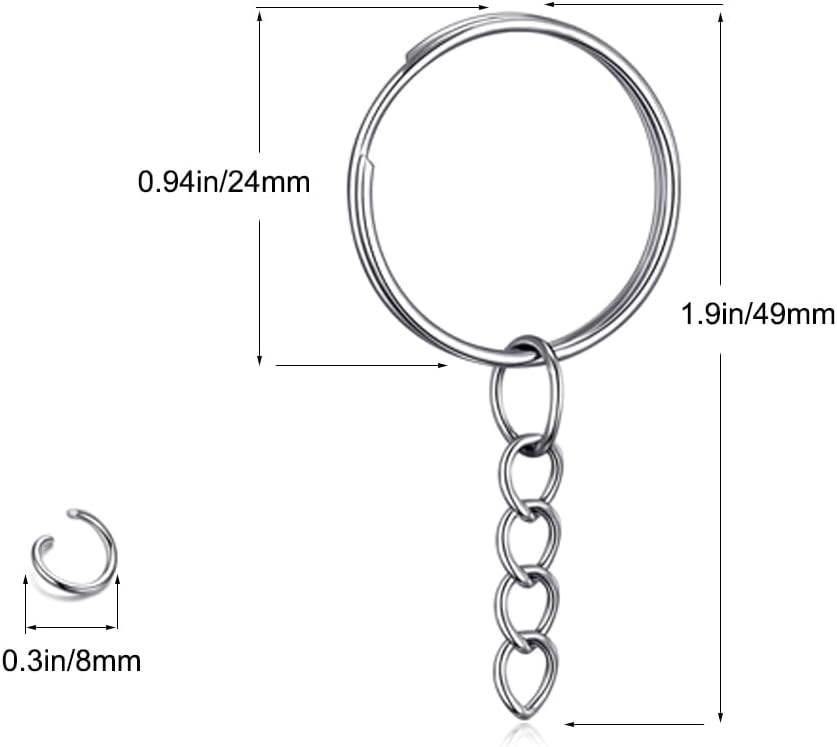 Package Include: Key rings with chain bulk come with 30 pieces of metal keychain rings with chain and 30 pieces of open jump rings. Total 60 pieces of keychain findings. The split ring is 0.95 inch/24mm in diameter and the thickness is 1.2mm, the chain is about 1inch/2.5cm in length, the open ring is about 1mm in diameter and a thickness is 0.8mm, total length of about 1.77inch/45mm.