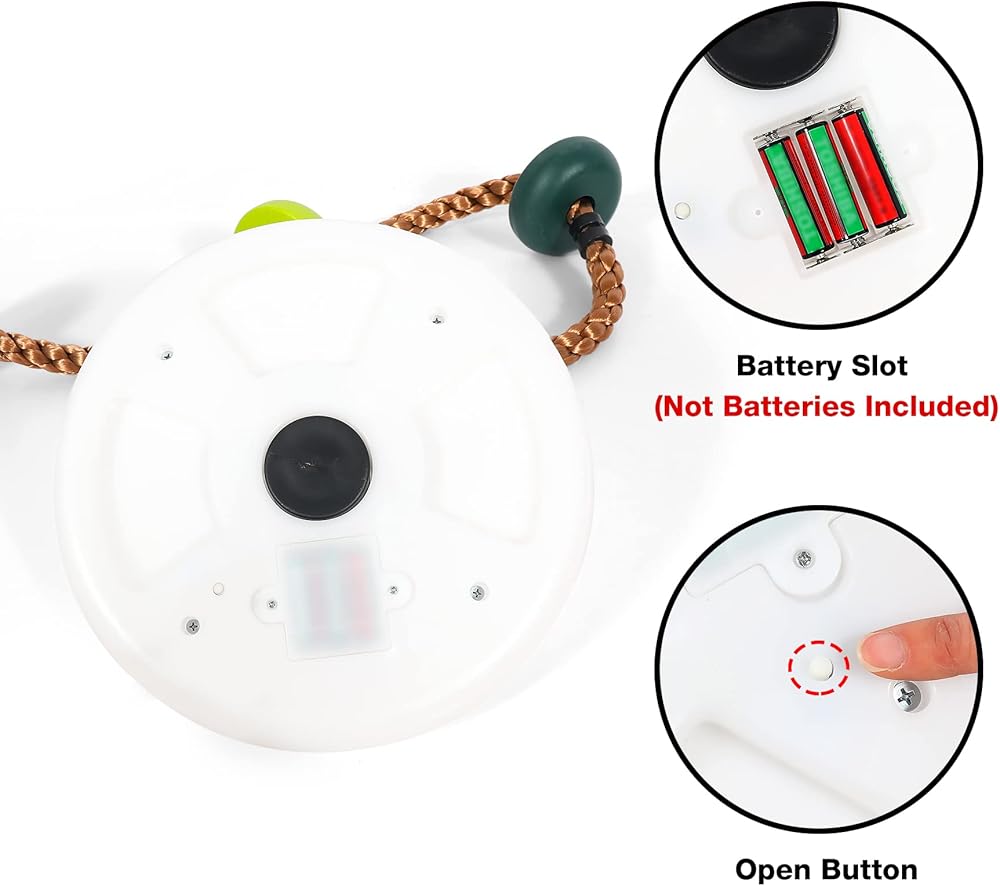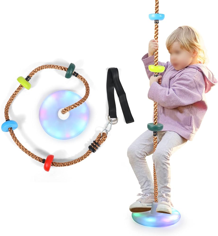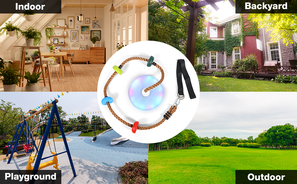Durable Material: Strong and long lasting PE rope protects your little one's tiny fingers from getting pinched and provides a comfortable grip. Rope length is 78.7''/200cm. The diameter of base is 11.8''/30cm. This LED disc swing seat can hold up to 220lbs/100kg.
