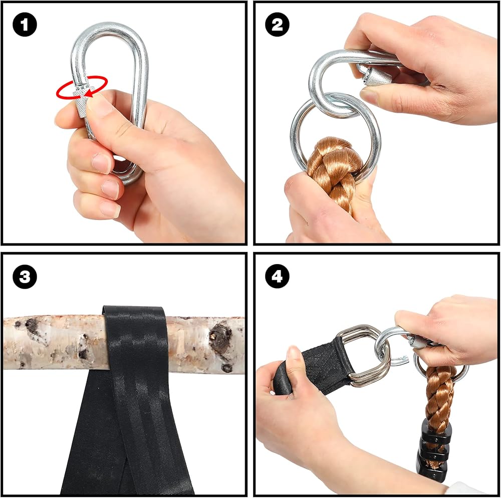Easy to Set Up: All neccessary parts included. 1 disc swing seat attached to braided rope with metal ring, 1 tree strap. You would not believe how easy the installation is.