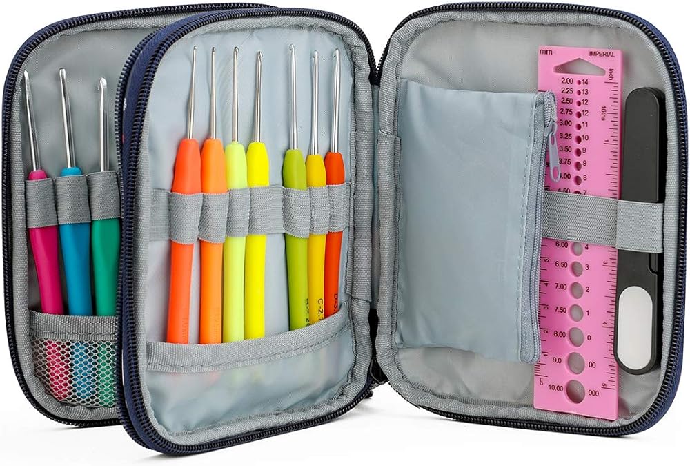 【LARGE CAPACITY CASE】 Main storage space with a insert plate(in total 11 large elastic bands, 10 small elastic slots) is enough roomy to fit for most crochet hooks on the market, like thick handled ergonomic crochet hooks kits, interchangeable circular knitting needles, aluminum crochet hooks, bamboo handle crochet hook, steel crochet hook set, aluminum knitting needles and more