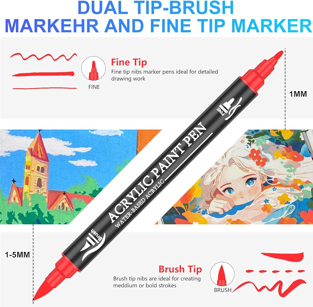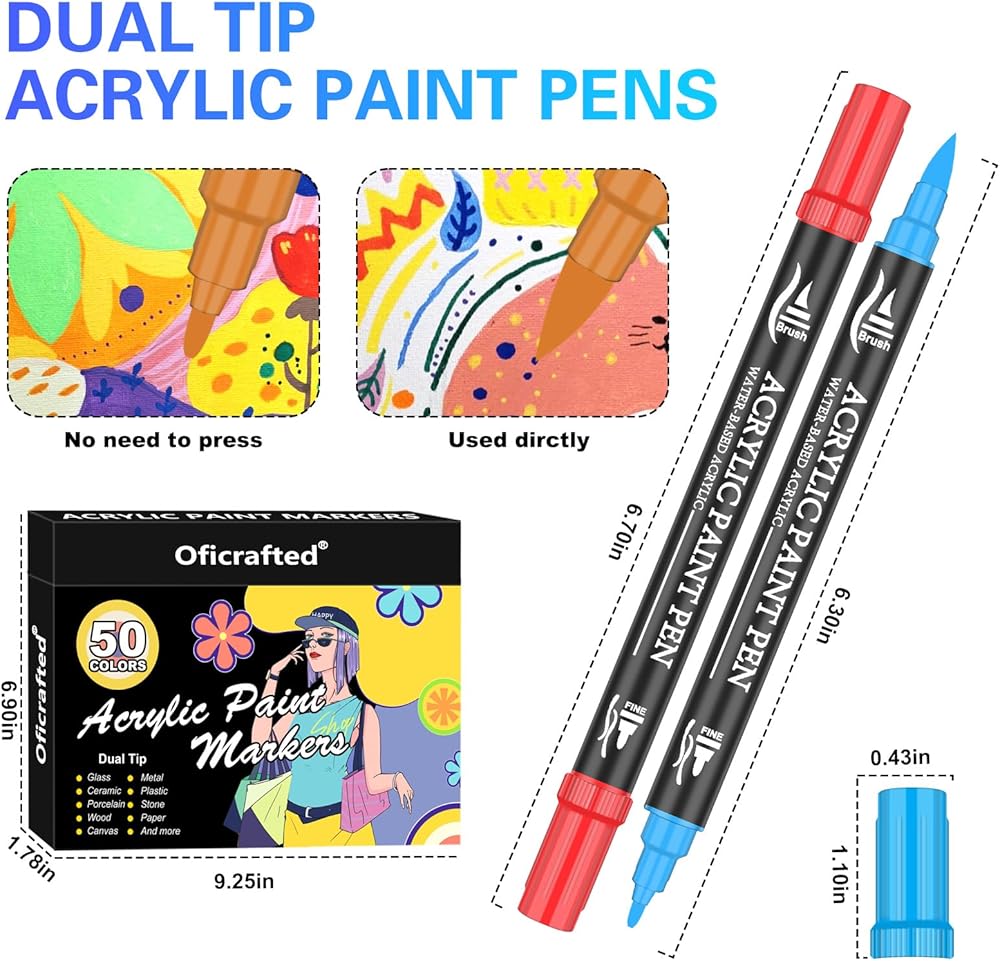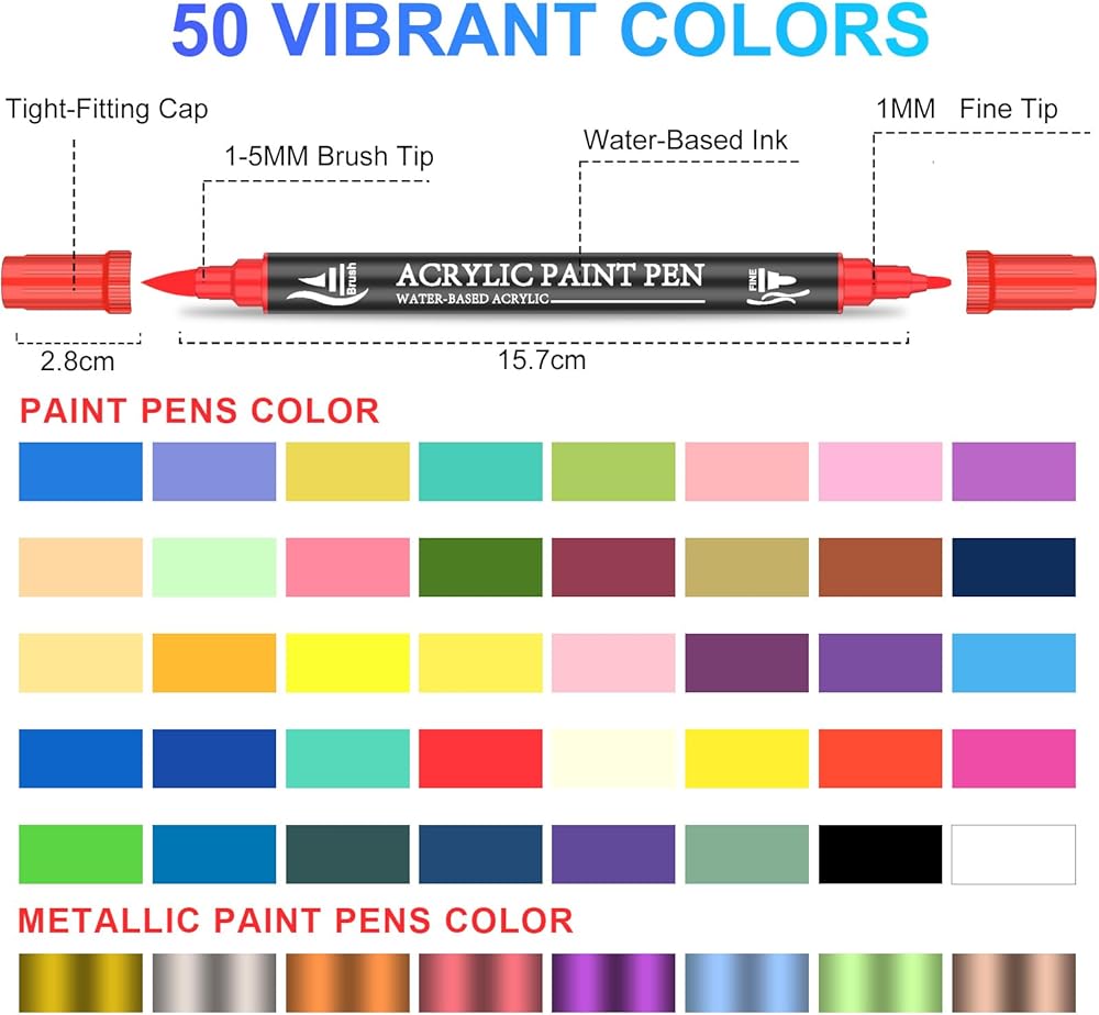 Acrylic Paint Pens, 50 Colors Dual Tip Markers with Fine and Brush Tip, Premium Marking Pens Set for Rock, Wood, Plastic, Fabric Painting and DIY Crafts