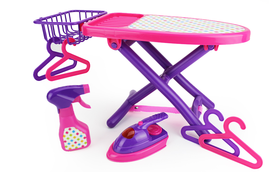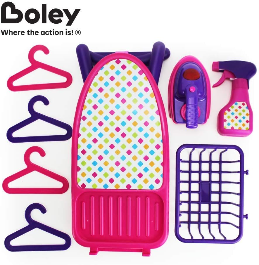 Boley Pretend Play Laundry Playset - 8-Piece Pink and Purple Toy Ironing Board Set with Realistic Lights & Sounds Iron, Working Spray Bottle, Hangers, and Storage Basket for Kids and Toddlers
