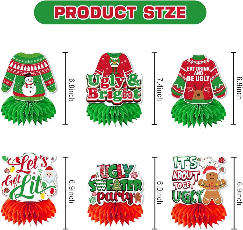 package contains: the ugly sweater party supplies come with 12-piece 3d ugly sweater centerpieces for tables, each with a different style, including ugly sweater, christmas trees, it's about to get ugly and more. colorful designs give you many possibilities to decorate and give you a wonderful christmas winter.our ugly sweater table decors are decorated in red, green, and white to create an intense christmas atmosphere