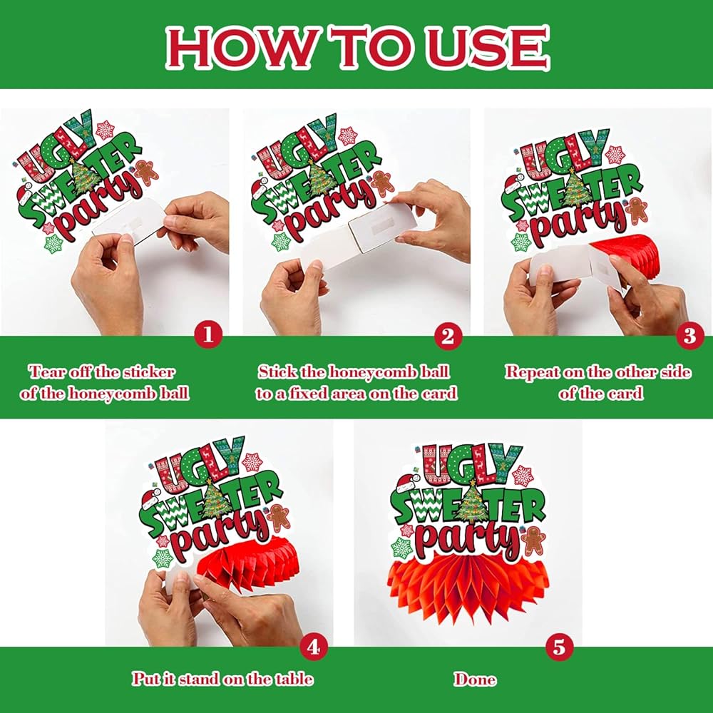 simple to assemble: these ugly sweater christmas party decorations honeycomb centerpieces can be assembled according to the pictures in just a few seconds, and then put in your favorite display area to easily decorate your party, saving time and effort. ugly sweater table decor full of christmas elements is the highlight of this winter, and you and your friends will be pleasantly surprised by them