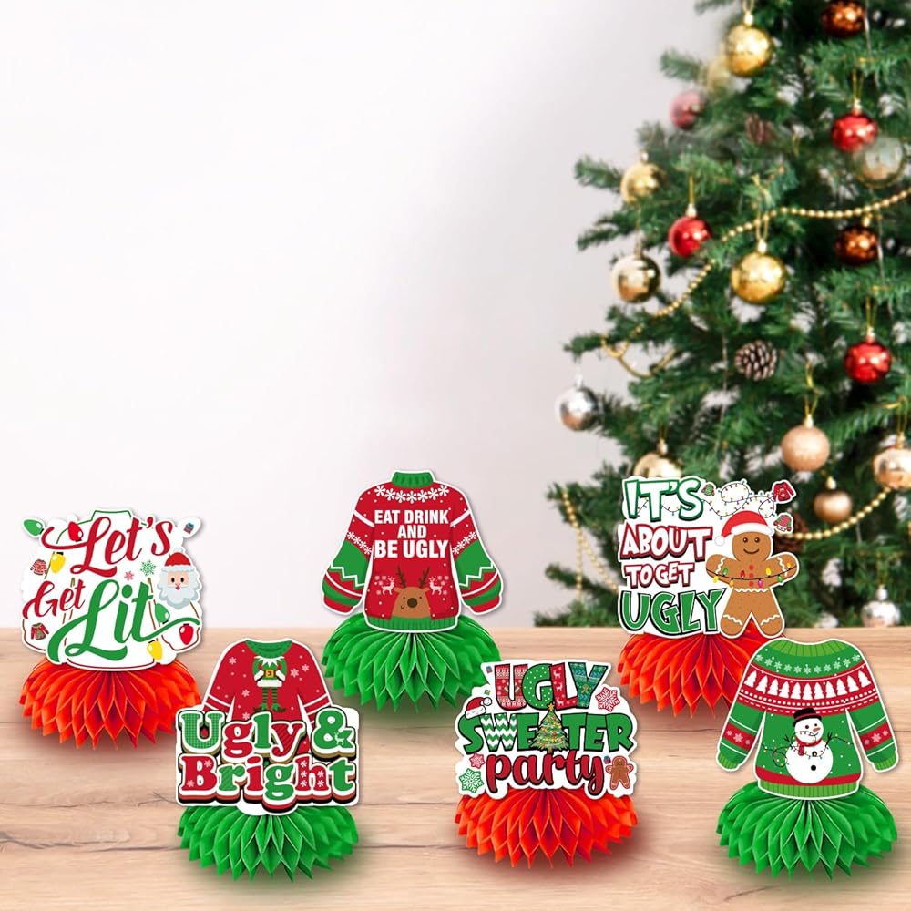 12Pcs Ugly Sweater Party Decorations Honeycomb Centerpieces, Ugly Christmas Sweater Party Decorations Table Centerpieces, 3D Double Side Ugly Sweater Table Decor for Ugly Christmas Sweater Party