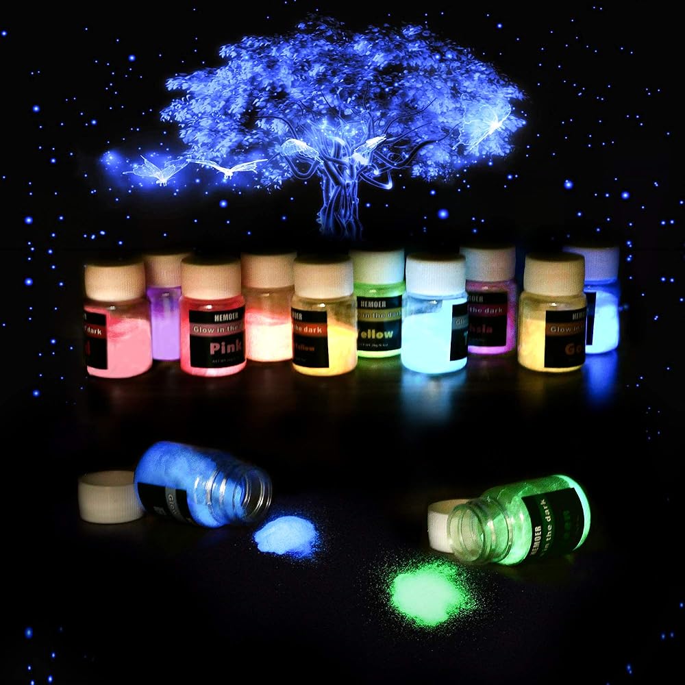 HEMOER 12 Colors Glow in the Dark Pigment Powder, 0.7oz/Bottle Luminous Mica Powder Perfect for Epoxy Resin Safe Non-Toxic Fluorescent for Nails, Acrylic Paint, Halloween, Fine Art & DIY Crafts