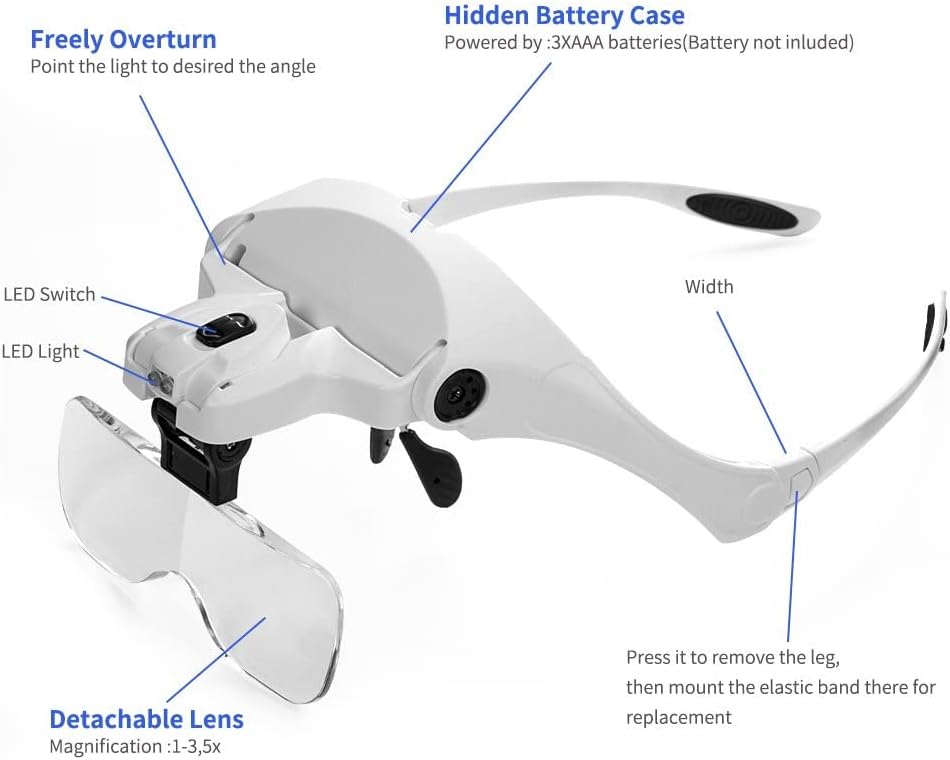 MORE COMFORTABLE TO WEAR: You can put this head mount magnifier on your head like a pair of glasses. Ergonomic frame design. Mirror leg can be removed and changed to elastic band. This headband magnifier glasses has a very light weigh so that you would not feel any burdened or uncomfortable.