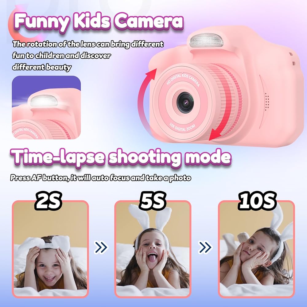📸【Rotatable Lens】: This kids camera is equipped with a lens rotation function, when the lens is rotated to the angle you want, press the button, after three seconds you will get a photo that you are satisfied with and is cute and interesting.