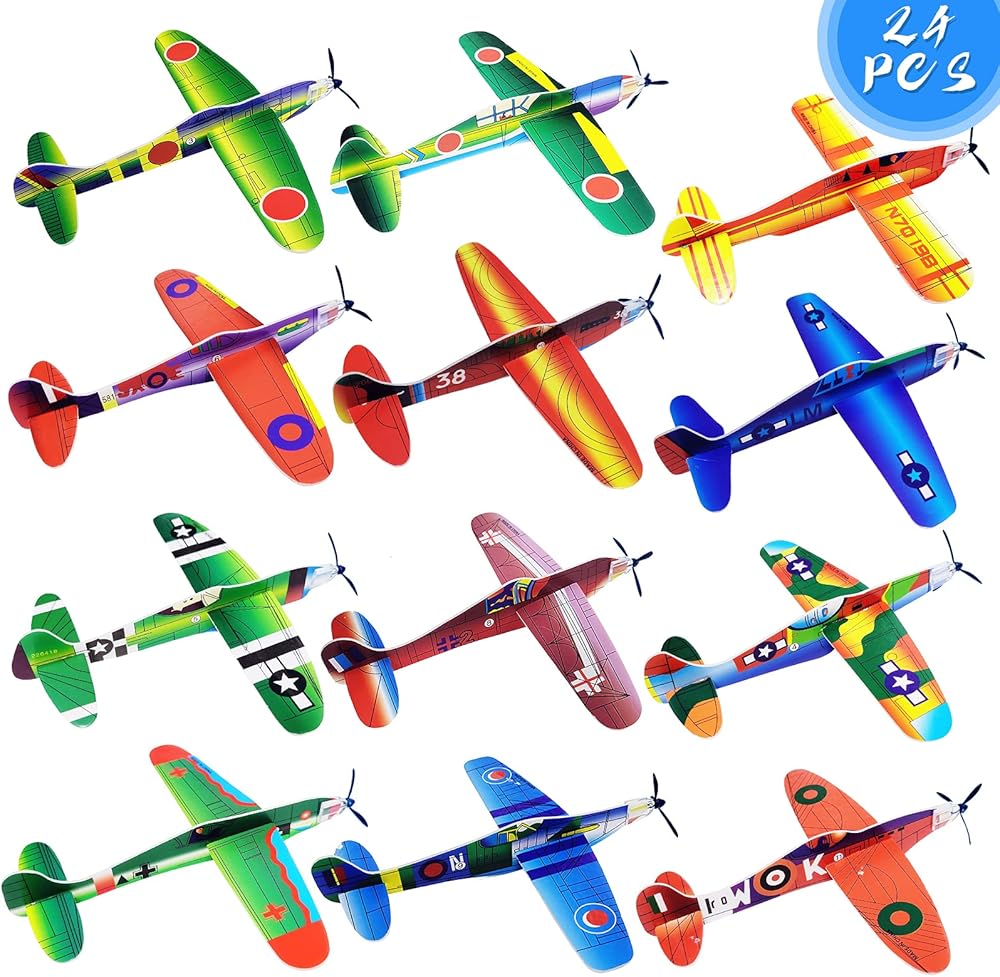 ✈VARIOUS STYLES: Each package showcases a variety of aircraft models and styles, including historical and war aircraft models. Covered with foam, these gliders are sturdy, have bright, vivid colors that won't fade, and are 8 inches long. The glider soars through the air with its propellers spinning. With propellers spinning in the air, these gliders will enchant children compared to real airplanes.