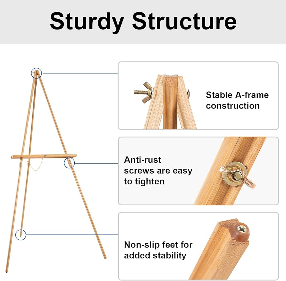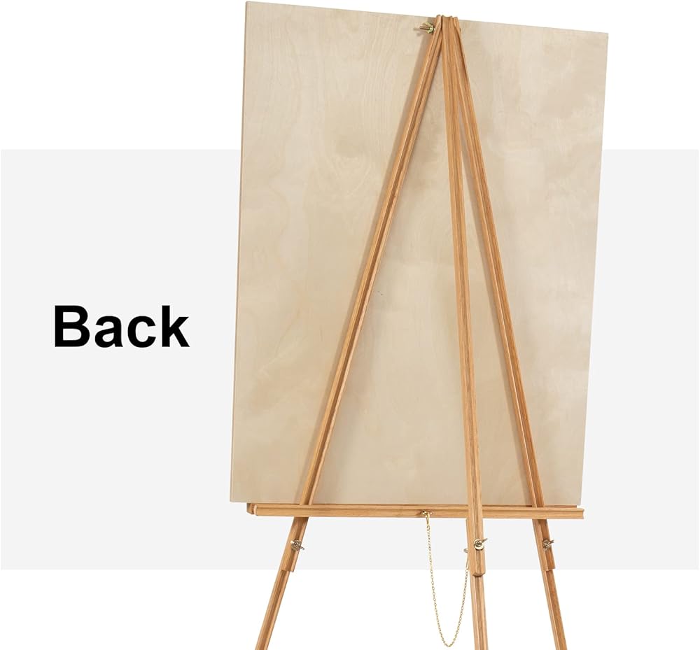 STURDY STRUCTURE: Our easel stand is made of sturdy solid wood with a natural wood surface and it features a stable A-frame construction. The third leg is secured with one metal chain and the legs have rubber feet for added stability. You can twist the nut to adjust the easel angle to desired working position.