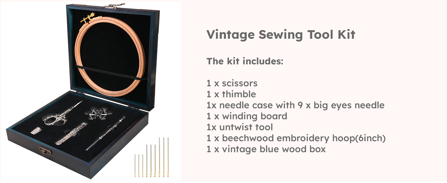 【A Complete Vintage Embroidery Set】 Coming with embroidery scissors, a thimble, a needle case with 9 pcs big eyes needles, a winding board, an untwist tool, a beechwood embroidery hoop(6 inches), and a vintage blue wood box with placeholders, suitable for your embroidery and sewing work
