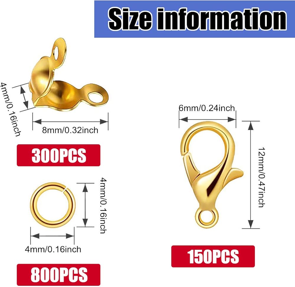 Product Size: the open bead tips knot cover is about 0.16 x 0.3 inch/ 4 x 8 mm, jump ring connector measures approx. 0.03 x 0.16 inch/ 0.7 x 4 mm, and each of lobster claw clasp is about 0.23 x 0.47 inch/ 6 x 12 mm