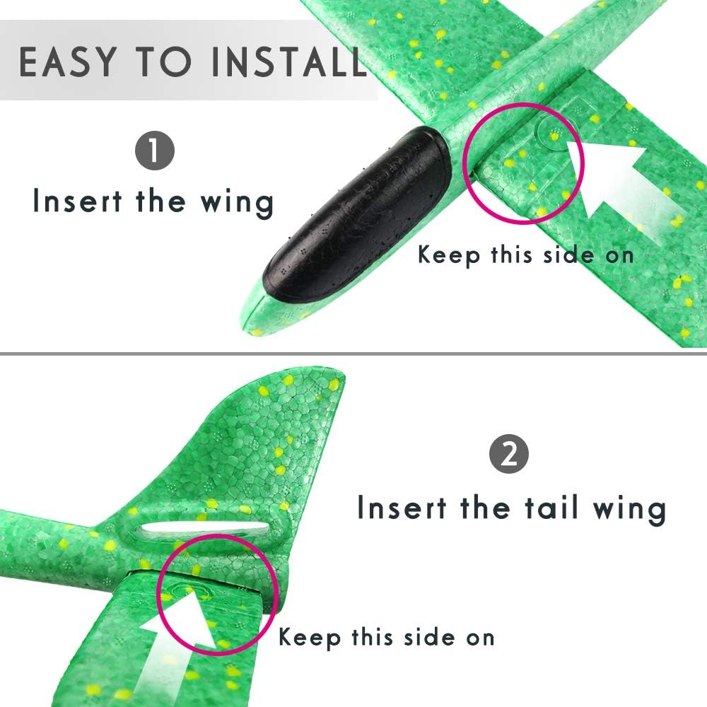 ✈ 3 Flight Modes -- When the foam glider "Gliding Mode" on top, it is the sliding mode; when the "Gyrant Mode" on top, the plane will circling in sky, it depends on the installation direction of the tail. and when you throw the foam aircraft reversal, it will be "Reverse Mode", Try it now, it's interesting flying competitive toy for kids and adult.