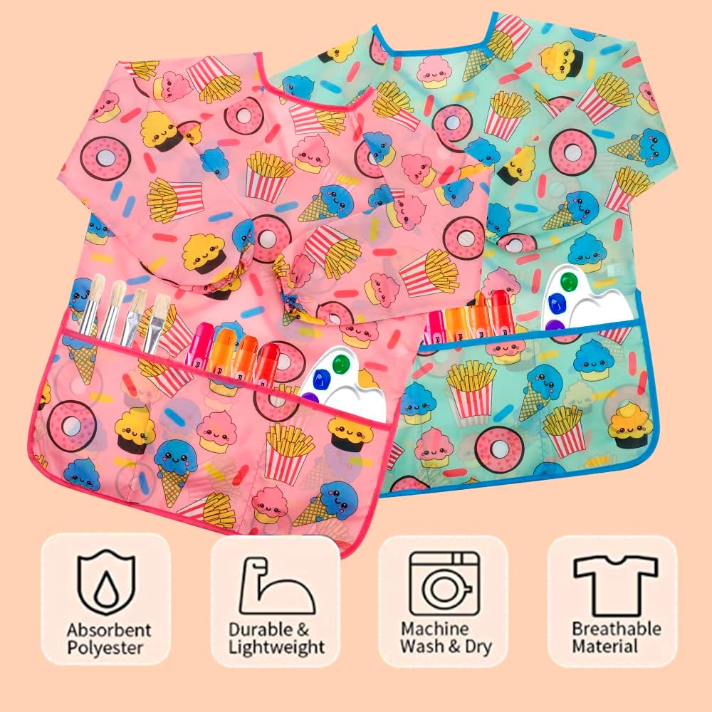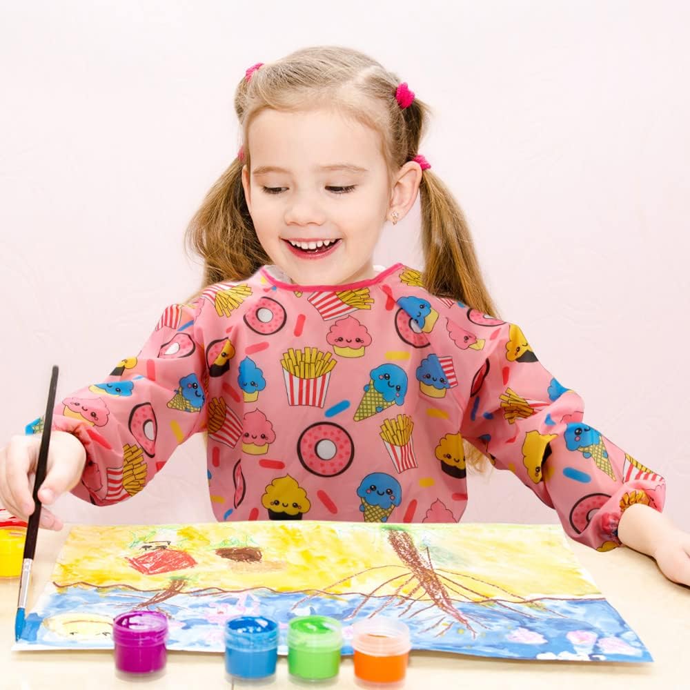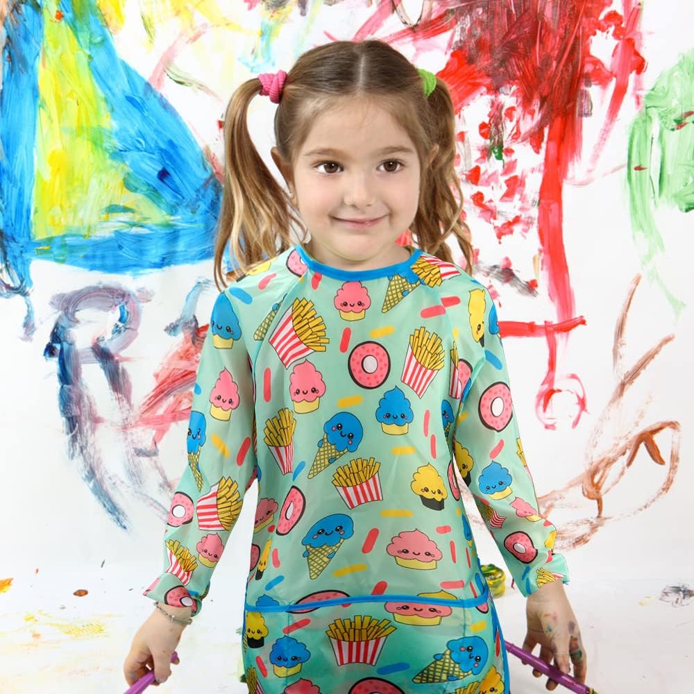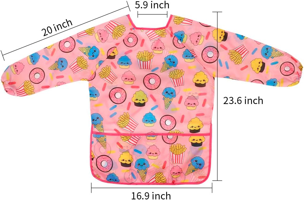 OVERALL SIZE - The measures of kids art smock is 23.6 x 17.3 inches, long full sleeve. The elastic on the smock long sleeves will make the kids easy to pull up sleeves for washing hands. One size suitable for kids from 2 to 6 years old painting, cooking, eating, doing crafts with finger painting and other recreational activities. The great size is an all over protection and with the waterproof material you can rest easy that you little ones clothes will stay clean.