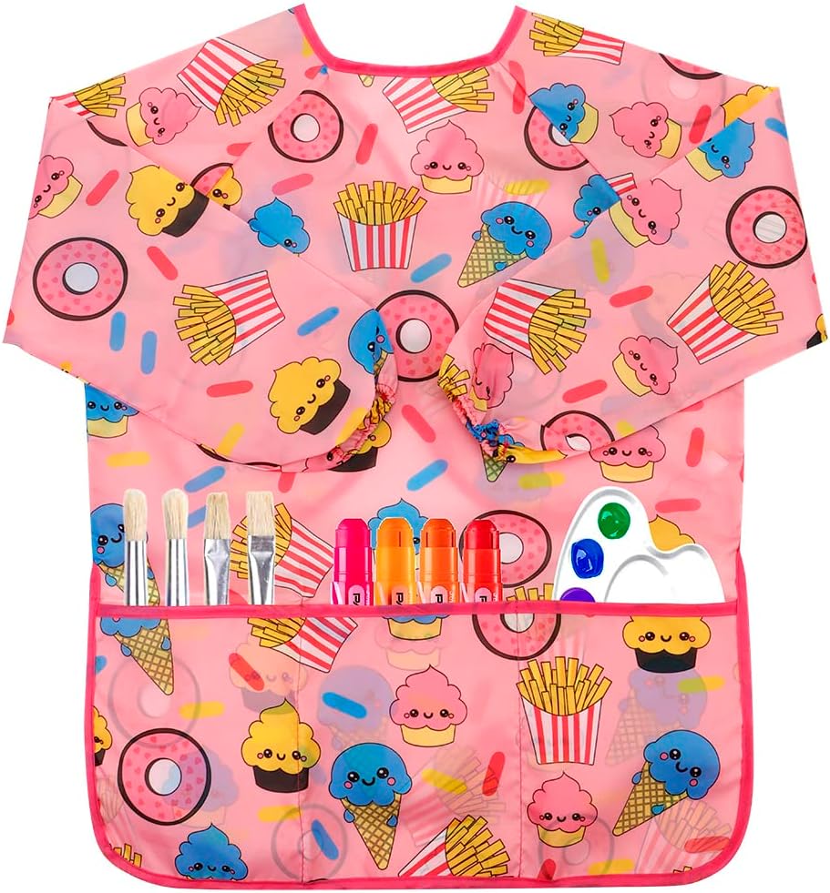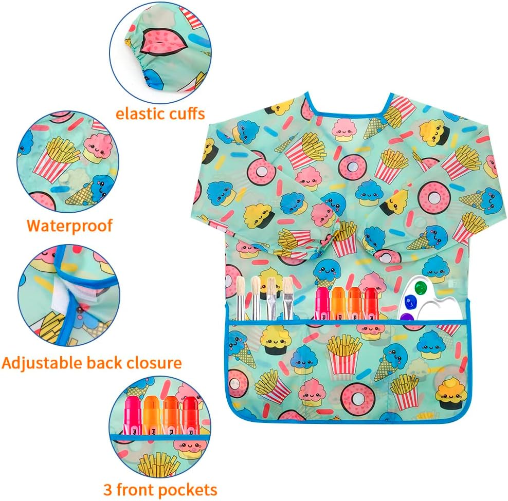 EFFECTIVE PROTECTIVE DESIGN - Our kids art smock comes with long sleeves for best protection and the adjustable closure design on the back for easy put on and off, In addition to that, the 3 front pockets of the toddler painting smock help children to hold water pen, paint, snacks and paper towels and other items.