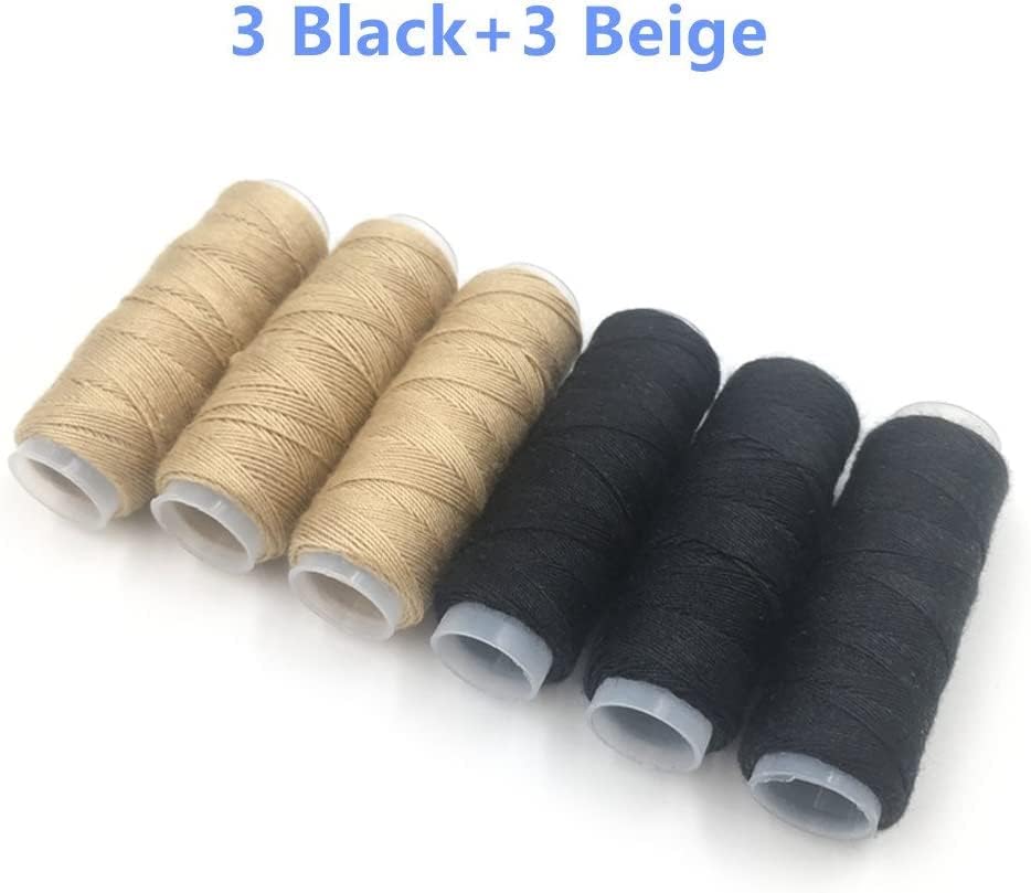 Comes 3 rolls black and 3 rolls beige,tt is a bonded 3-ply nylon thread.