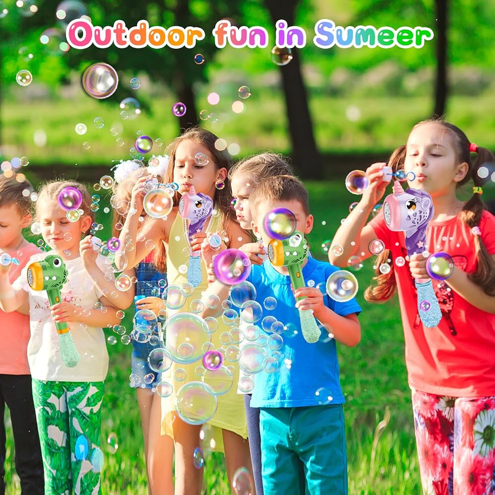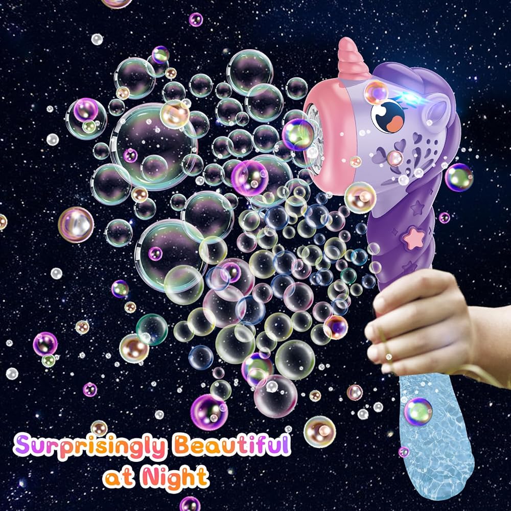 🫧 EASY TO USE: The bubble maker is easy to operate, just screw the bubble solution bottle heel onto the bubble maker and install 4PCS AA batteries for the bubble gun. Then, kids just need to turn on the switch and wait for a few seconds to enjoy the colorful bubble world.