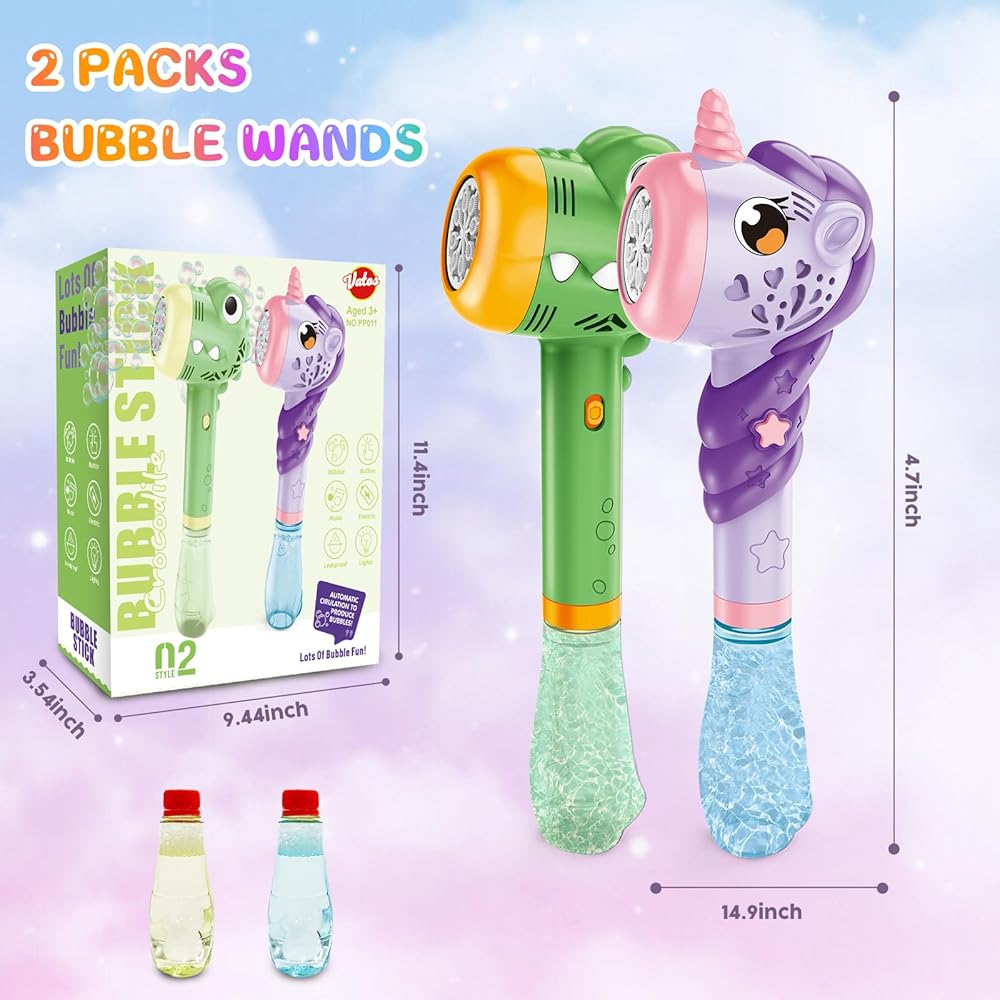 🫧 UPGRADED AUTOMATIC BUBBLE MACHINE GUN - VATOS bubble machine gun set includes a green crocodile bubble machine, a purple bubble machine, 2 bottles of 180ml refill liquid. Blows over 7000 colorful bubbles per minute. It also comes with lights and music to create a romantic and magical atmosphere with colorful bubbles that will bring fun to children anytime of the day.