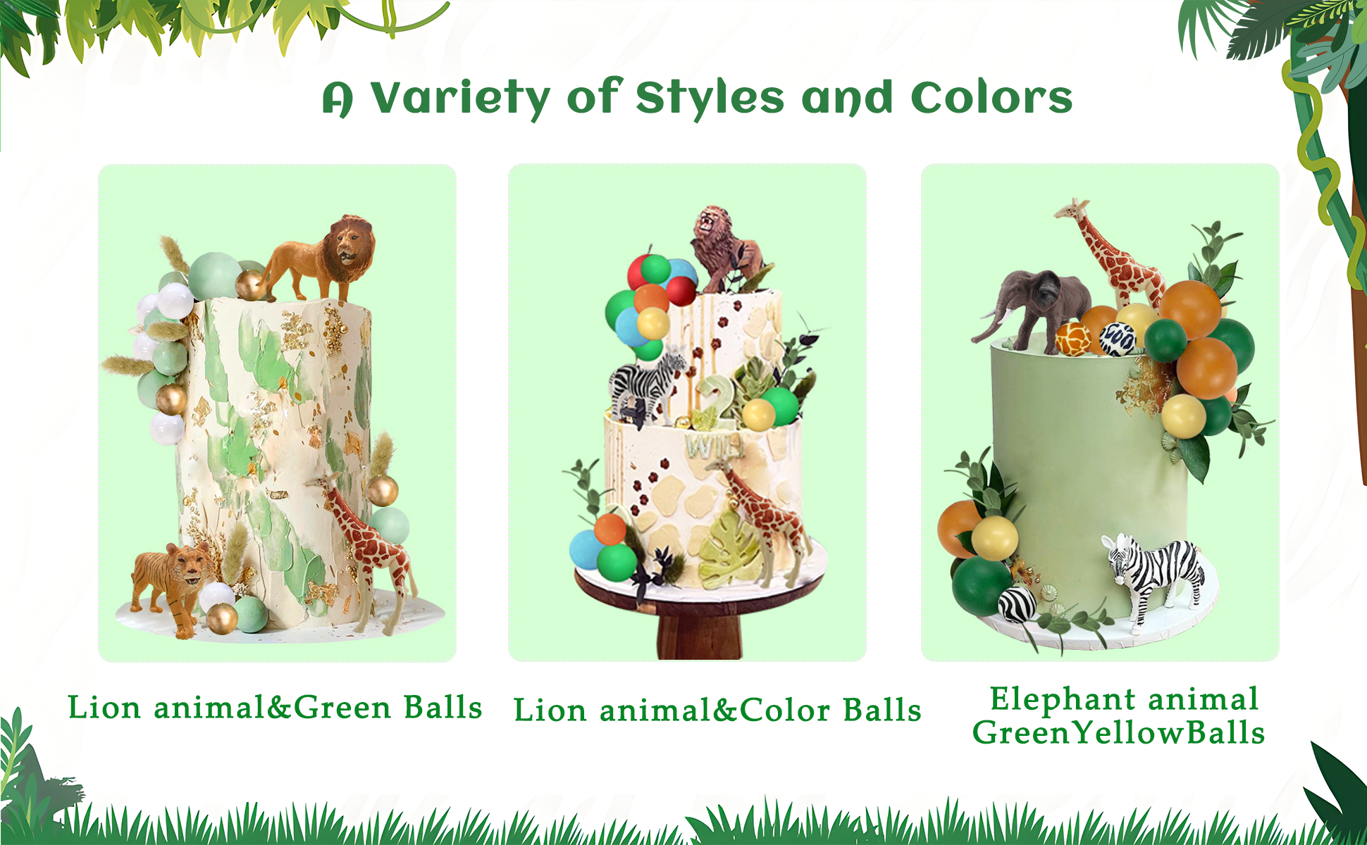 PACKAGE – Including a giraffe, an elephant, a zebra, 16 balls cake toppers and 5 green leaves.