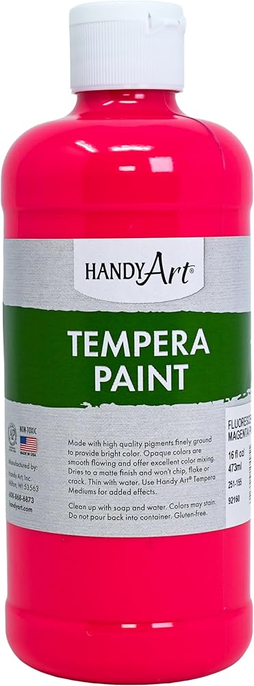 Handy Art Metallic Tempera Paint offers excellent opacity and coverage and adds a lustrous gleam on art, craft and school projects! These creamy temperas can be used on surfaces such as paper, poster board, cardboard, wood and papier-mâché. Paint dries to a matte finish and won't chip, flake or crack when dry. Paint is non-toxic, water based and gluten-free and cleans up easily with soap and water. For ages 5 and up. Made in the USA. Certified AP Non-Toxic.