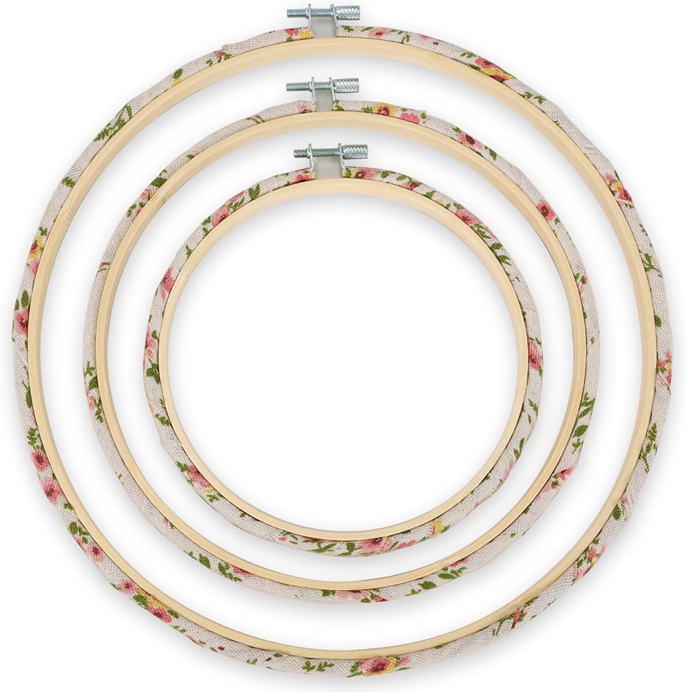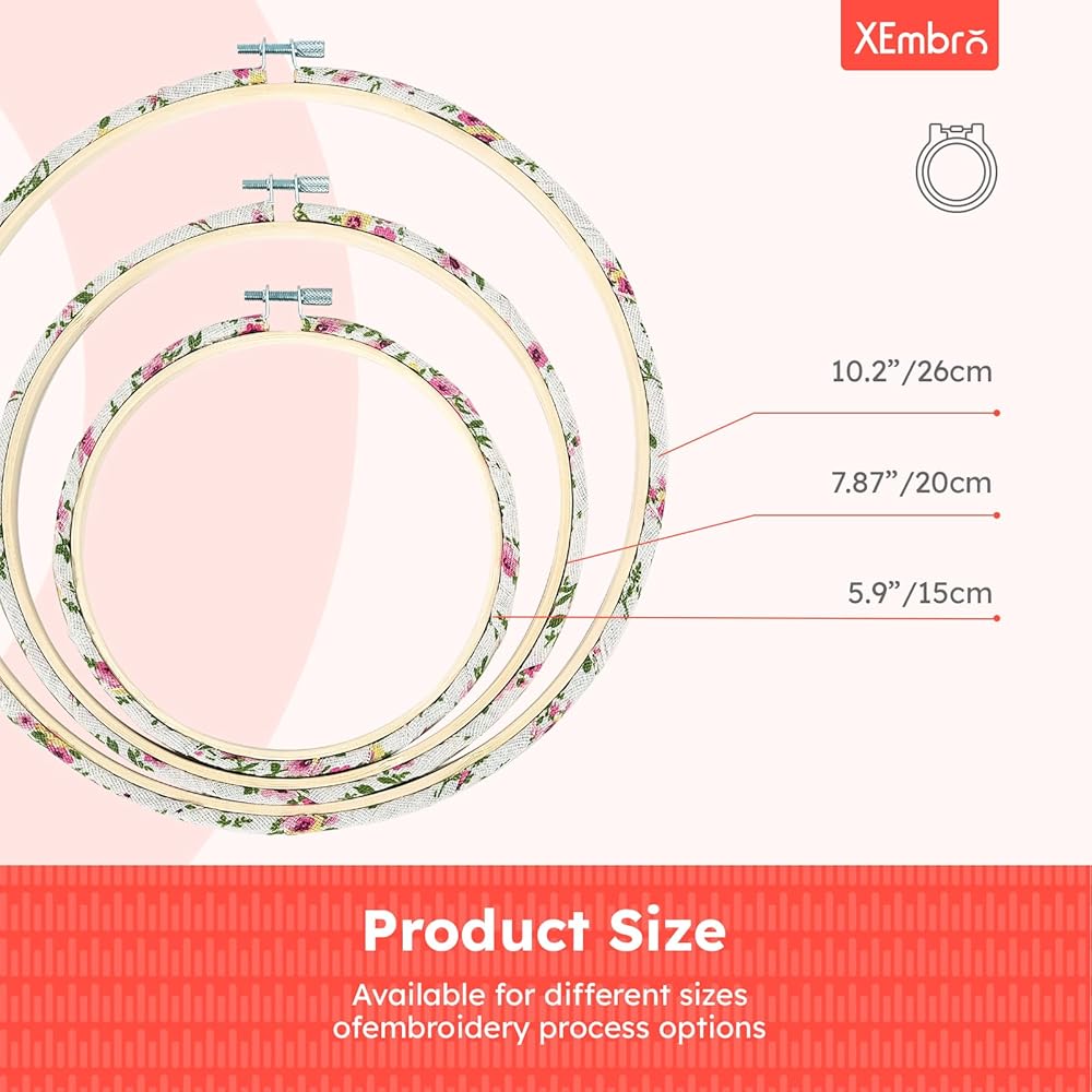 3 Size: The large size embroidery hoop is 10.2inch/26cm, the medium size is 7.9inch/20cm,the small size is 5.9inch/15cm, meet your different embroidery project needs