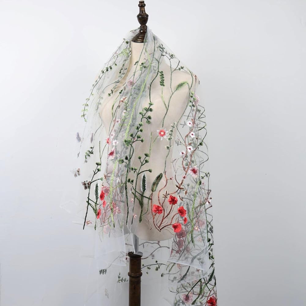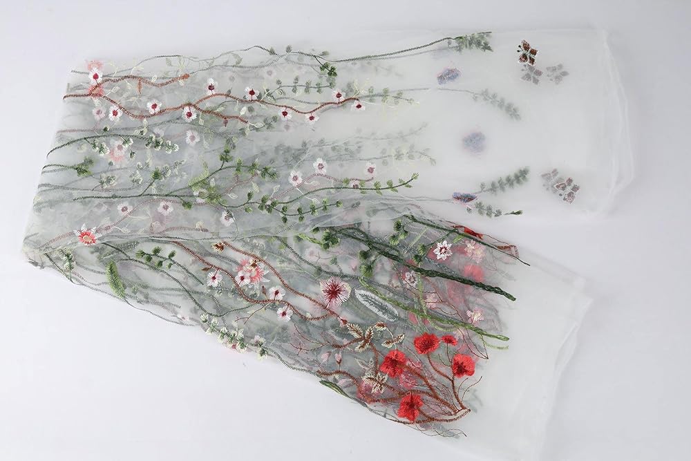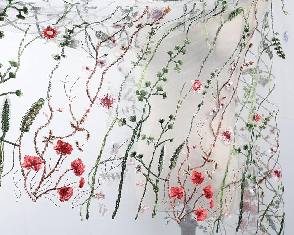 - There are florals and plants embroidered onto soft backing netting at 60" wide.
