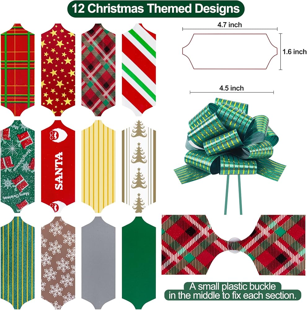 Value Pack: You'll get 12 Pcs Christmas bows decoration with 12 various of styles. These Christmas bows for presents are about 1.6" in width and 42.5" in length, each gift bow is a unique style and brings different surprises! Just flat ribbon. you need made into bows by yourself.