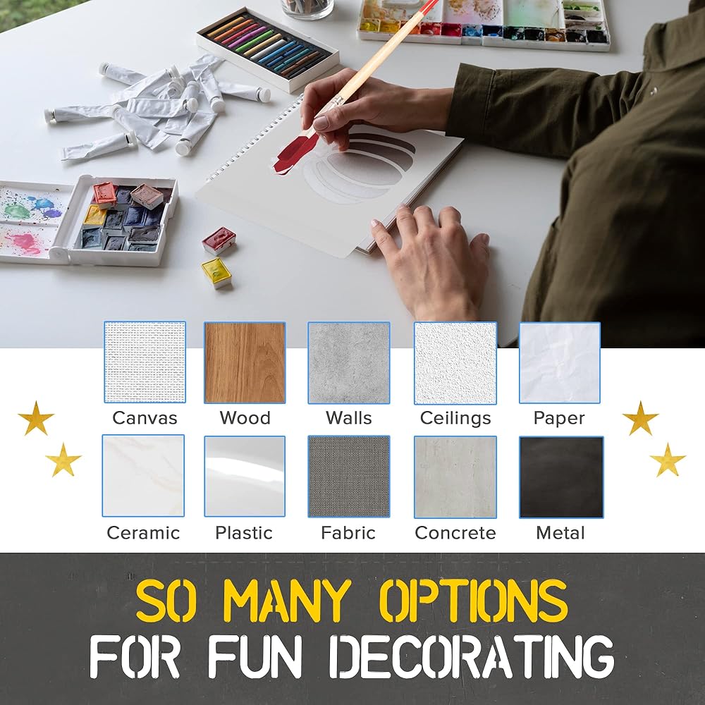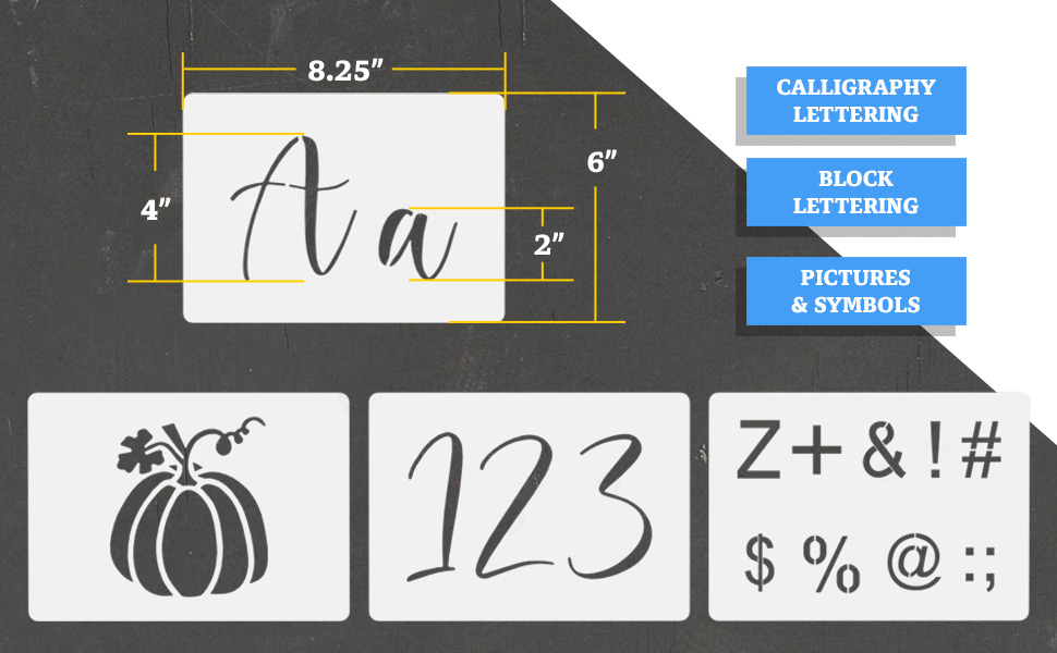 ✍ So Many Options for Fun Decorating -- Use the symbol & alphabet stencils for painting on canvas, wood, walls, paper, fabric, ceramic, plastic, vinyl, concrete, or metal. Perfect for signs, decorations, artwork, banners, cards, murals, home decor, chalkboards, and more! Easily celebrate holidays, seasons, weddings, and other special events.