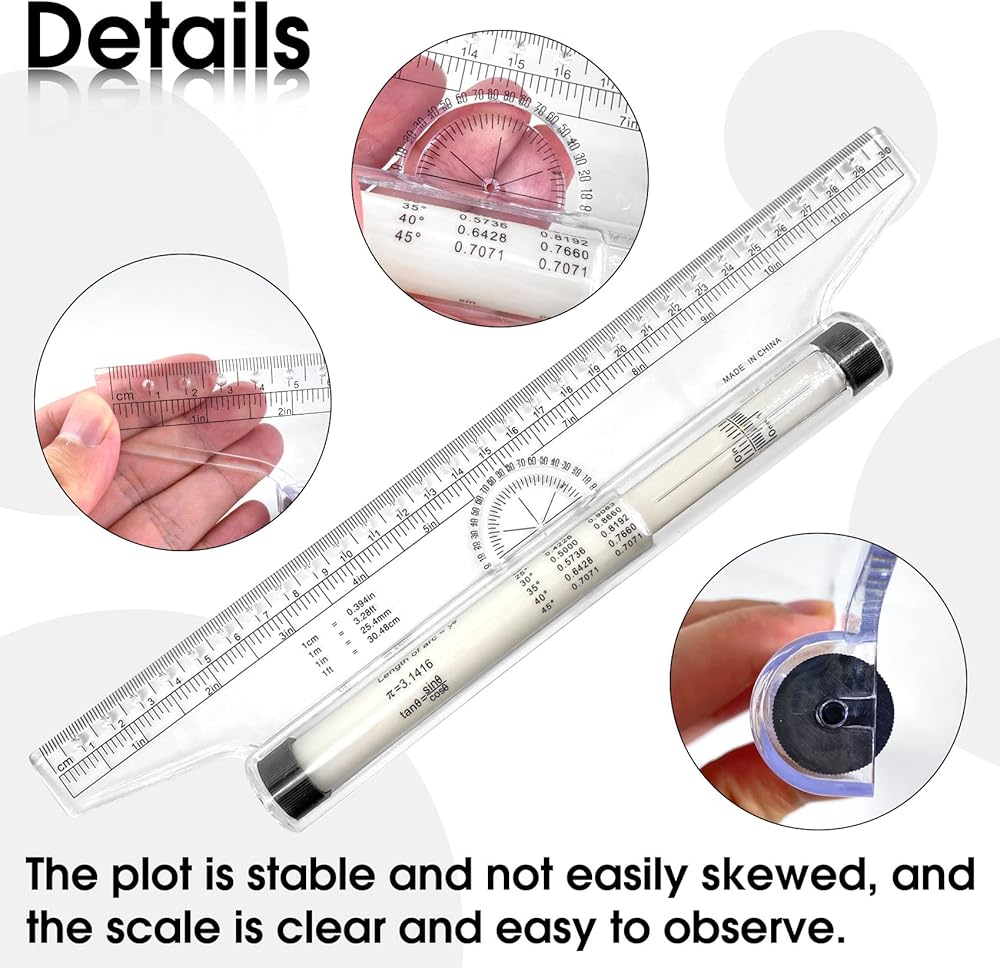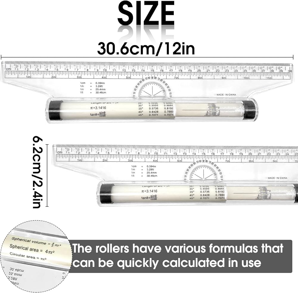 Multifunctional Rolling Ruler The 12 inch multipurpose ruler is ideal for designers, artists and students. It functions as a compass, horizontal ruler, straightedge, protractor, circle template and angle template all in one. Measures in inches and centimeters and includes many useful formulas and conversion factors. Quick and easy draw in quadrants, squares, circles, angles, crosshatching, vertical and horizontal parallel lines. How to Use: The use of protractor: Align the center of the protractor on the edge of the ruler with the vertex of the surveying foot, and at the same time, coincide the scale of the protractor with the datum line, then various angles can be measured on the edge of the ruler. To Draw the Arc and Curve: Insert the pen into the small hole at the ruler end to make the center of the circle, insert another pen into another hole and rotate the ruler body 360°to draw a circle. If the radius between the 2 holes is different or the rotation ruler body is different, different circles or arcs can be obtained. To Draw Horizontal Parallel Line: Press your hand on the ruler body, draw a horizontal line along the edge of the ruler, and then move the ruler up and down to draw a parallel line. To Draw Vertical Parallel Line: Insert the pen into the small hole on the edge of the ruler, slide the ruler up and down to draw a vertical parallel line. The distance between the vertical lines can be measured directly. Specifications: Material: Plastic Color: Clear Length: 12 inch Width: 2.4inch Package Included: 1 x Measuring Rolling Ruler 1.The color maybe tiny different from the picture because of the photograph. 2.Please allow a little bit of size deviation due to manual measurement.
