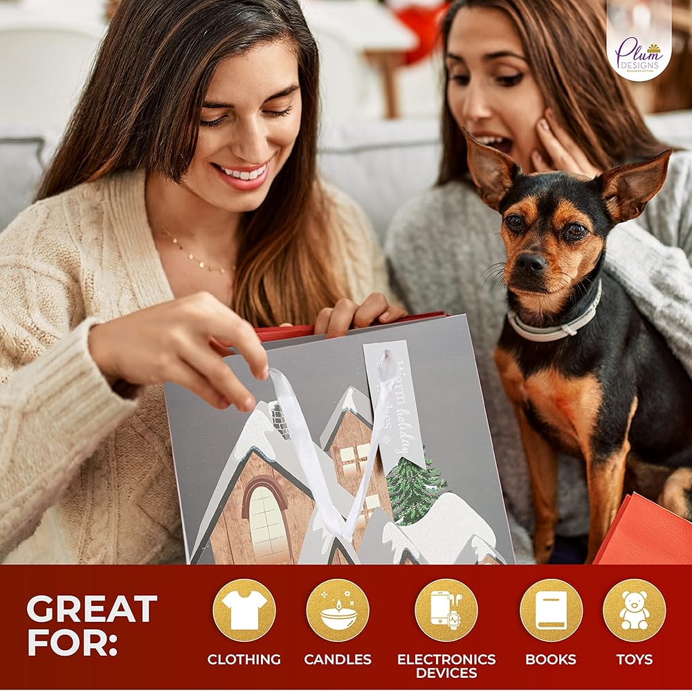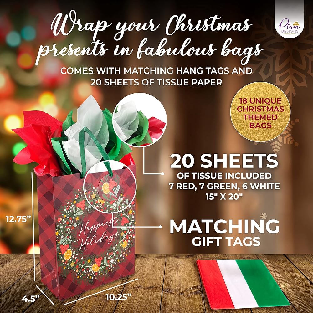Perfect Size- 18 Count Set of 12.75"X10.25"X4.5" inches Great For Your Christmas Gifts. Toys, electronics devices, Clothing and whatever you Dream. Embellish Your Gifts In These Plum Designs Christmas Bags
