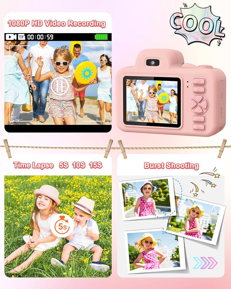【Multiple Functions】: Our digital camera for kids not only supports taking photos and videos, as well as playback, but it also includes a variety of functions such as one-click restore, time-lapse video recording, loop video recording, playback zoom, and the ability to disable audio recording. Additionally, it supports booth-style pictures, timed shots, and continuous shots.
