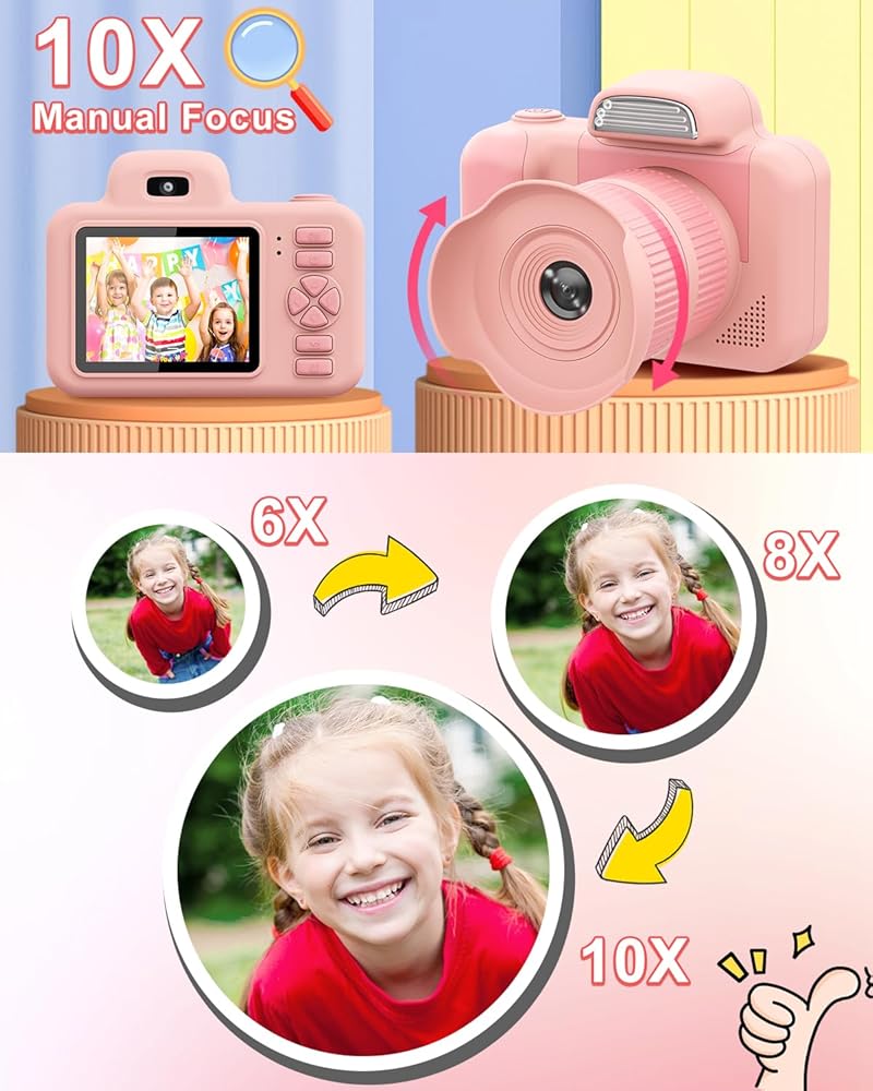 【Upgrade 10x Zoom Lens & Flash 】 This kids camera is equipped with auto 10x zoom rotation lens, 12MP and 1080P Video. Greatly improved the definition of photos . The flash design on the top allows you to accurately capture happy moments even in the dark. With Big head sticker shooting, children can take photos with frames, leave some hilarious photos with family or friends.