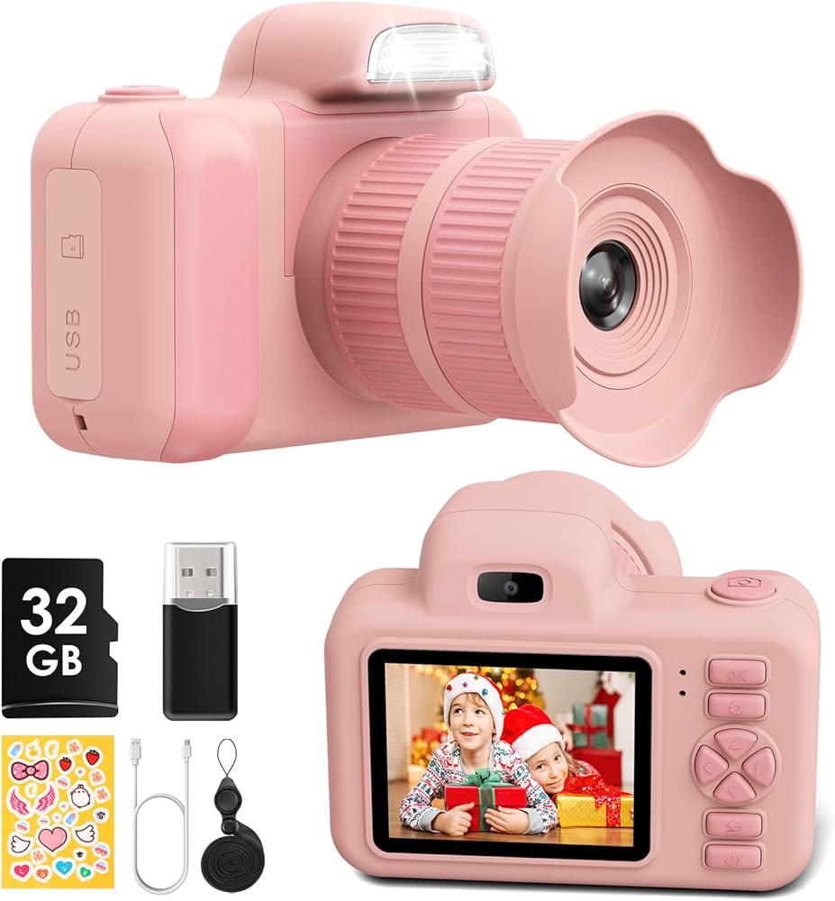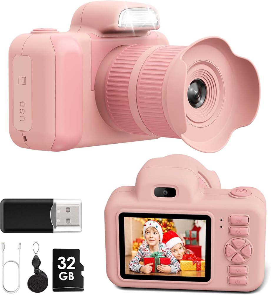 Kids Camera, Christmas Birthday Gift for Boys Girls Age 3-12, Digital Cameras with Flash for 3 4 5 6 7 8 9 Year Old Boys Girls 2 Inch Screen Selfie Camcorder HD 1080P Video 32GB Pink