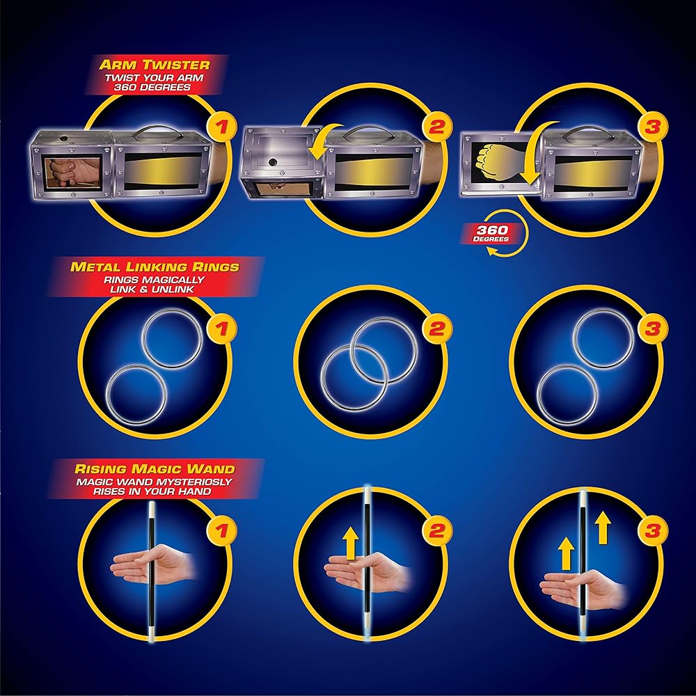 Packed with everything you need to perform mystifying tricks. Make your arm turn 360 degrees in the baffling Arm Twister. Mystify with the Linking Rings. Make a soap bubble become solid and bounce on the table! Produce candy or any other small item from the completely empty Wonder Box! Read minds, do great card magic and make solid objects float in mid-air. Experience the mystical powers of professional magic with these astonishing illusions.